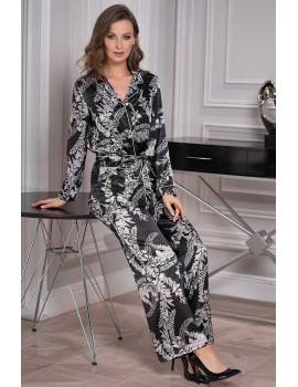 Женский домашний комплект двойка состоит из жакета с рукавами длиной 3/4 и прямых классических брюк. Жакет выполнен из принтованного искусственного шелка с блеском и однотонной...