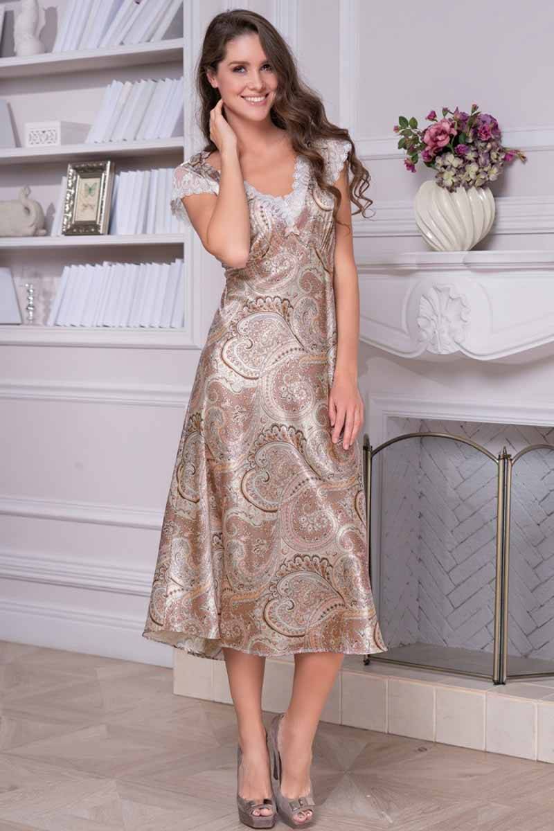 Элегантная длинная сорочка прилегающего силуэта. Короткий втачной рукав из кружева. Сорочка с подрезом под грудью и глубоким V-образным вырезом декольте, оформленным изящным кружевом. Сорочка выполнена из смесового шелка в пастельных тонах с восточным принтом "пейсли". Состав: 70% натуральный шелк, 25% полиэстер, 5% эластан. Производитель Mia-Amore Италия.
