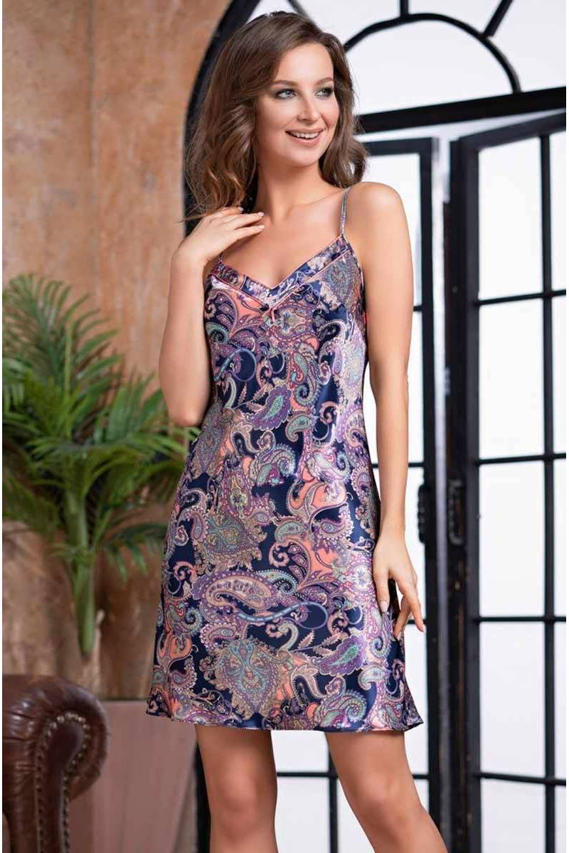 Короткая ночная сорочка Mia-Mia коллекция Etro. Модель прилегающего силуэта на тонких регулируемых бретелях. V-образный вырез декольте оформлен контрастным кантом. По центру лифа элегантный двухцветный бантик из атласа. Рубашка изготовлена из смесового шелка со сказочным восточным принтом "Пейсли" на синем фоне. Состав 70% натуральный шёлк, 25% полиэстер, 5% эластан. Производитель Mia-Mia Италия.