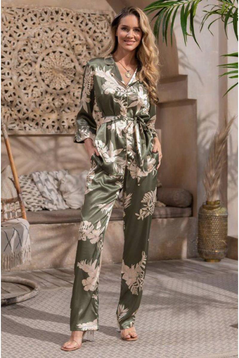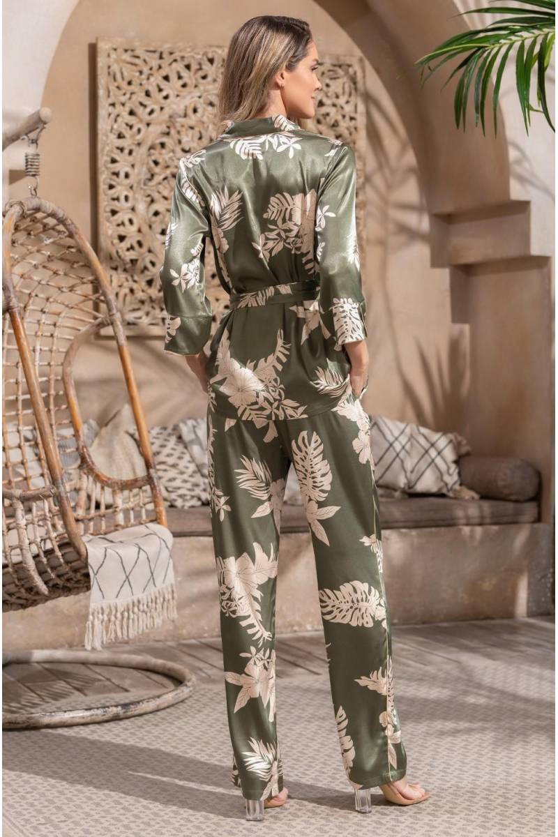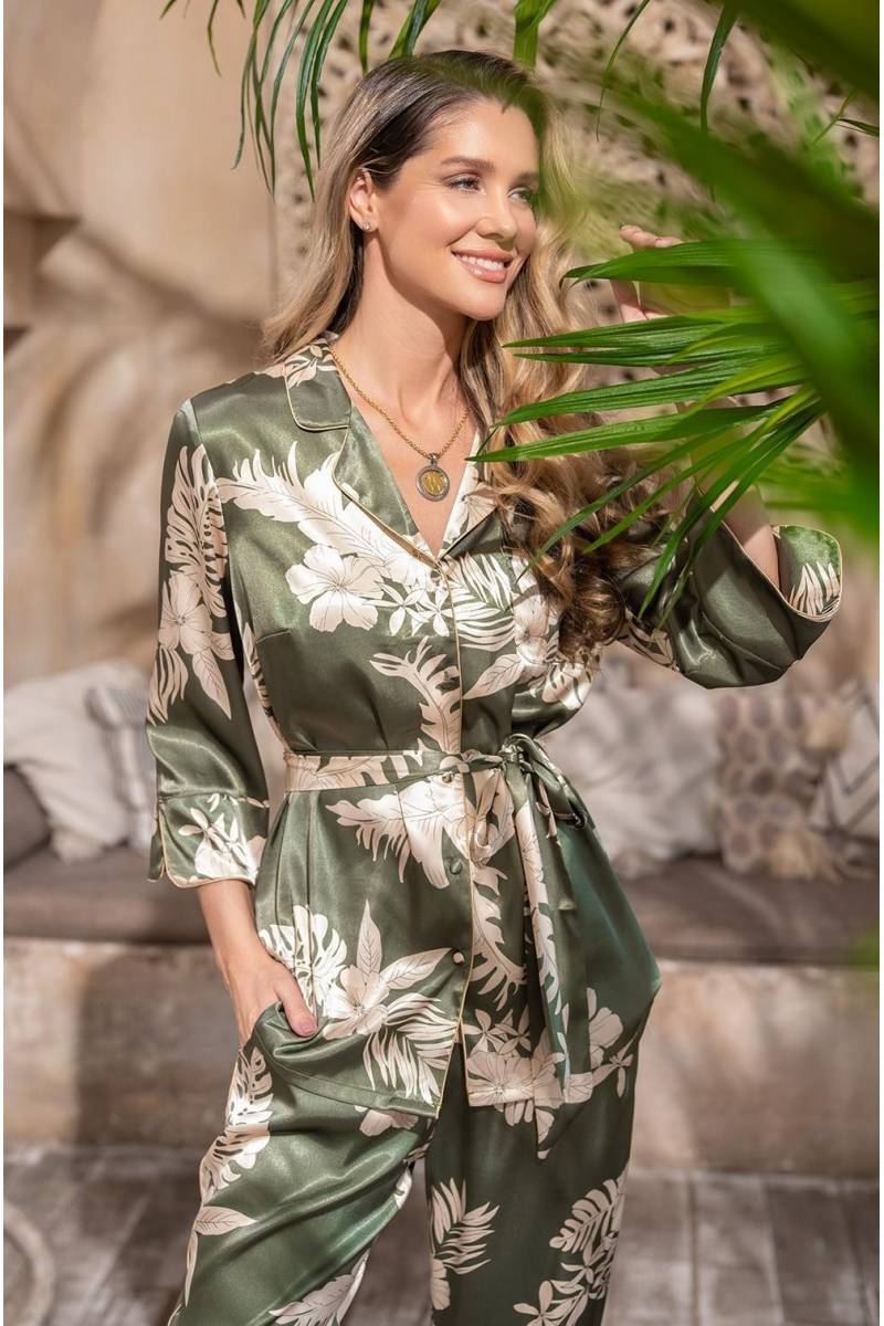 Женский домашний комплект - Mia-Amore Lorensa. Жакет фиксируется застежкой на пуговицы, пояс в комплекте. Втачной рукав 3/4 длины. Полочка с нагрудным карманом. Классические прямые брюки с поясом на резинке, боковые швы оформлены карманами. Комплект выполнен из шелкового смесового полотна с тропическим принтом. Отложной воротник и фигурные широкие манжеты украшены тонким кантом в тон изделия. Состав 70% натуральный шёлк, 25% полиэстер, 5% эластан. Производитель Mia-Amore Италия.