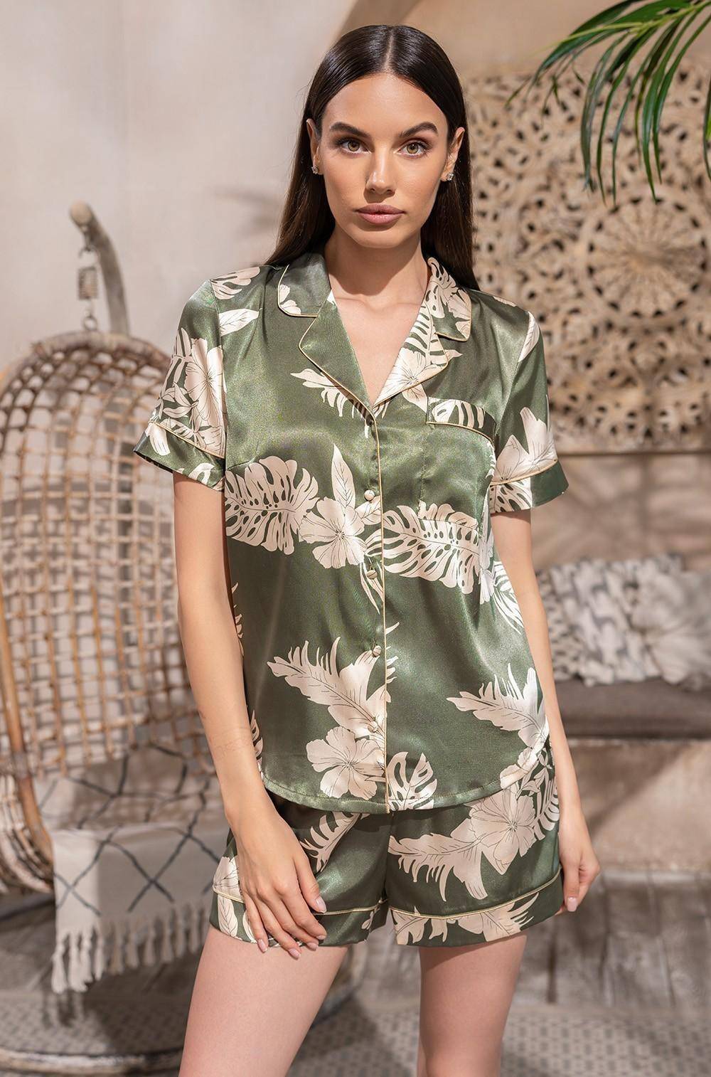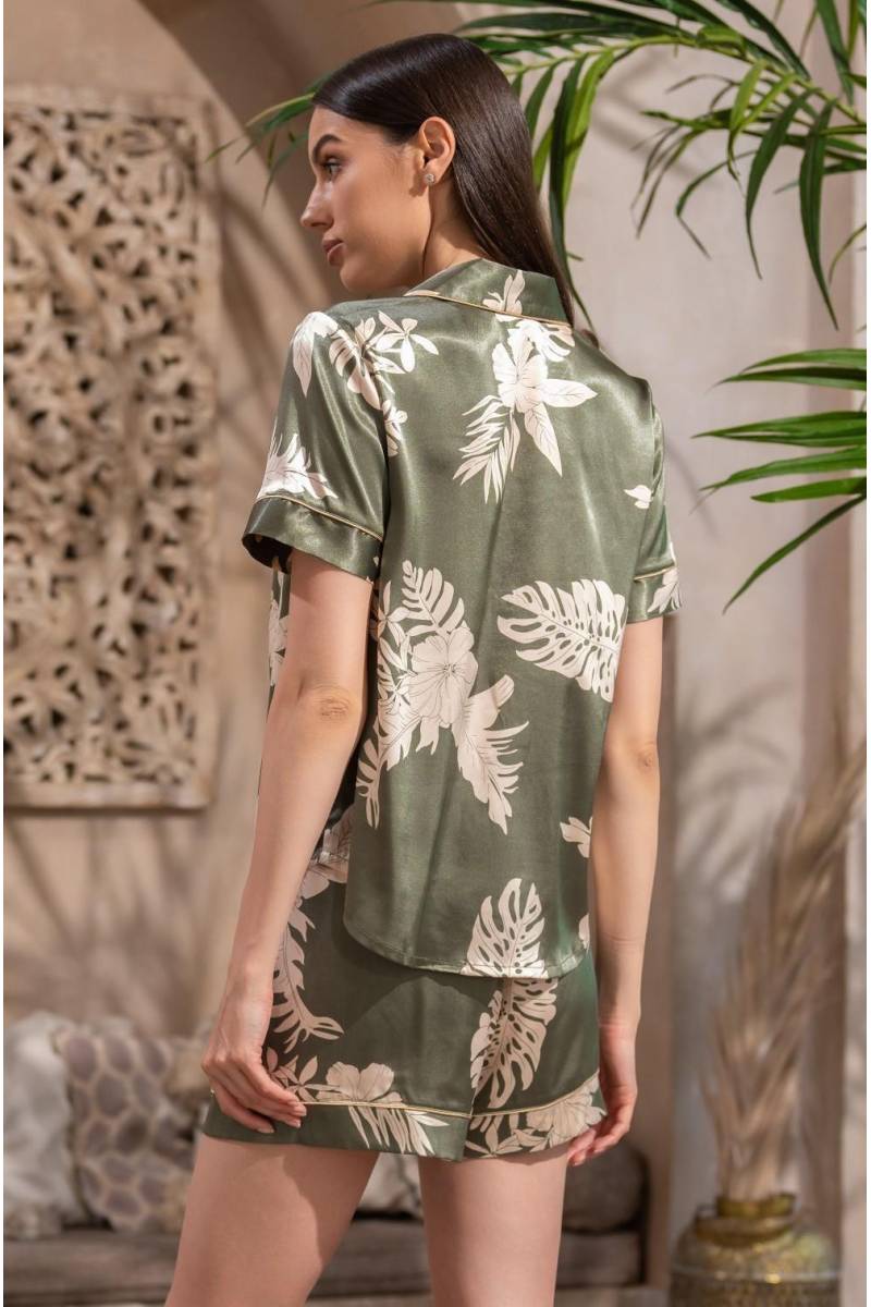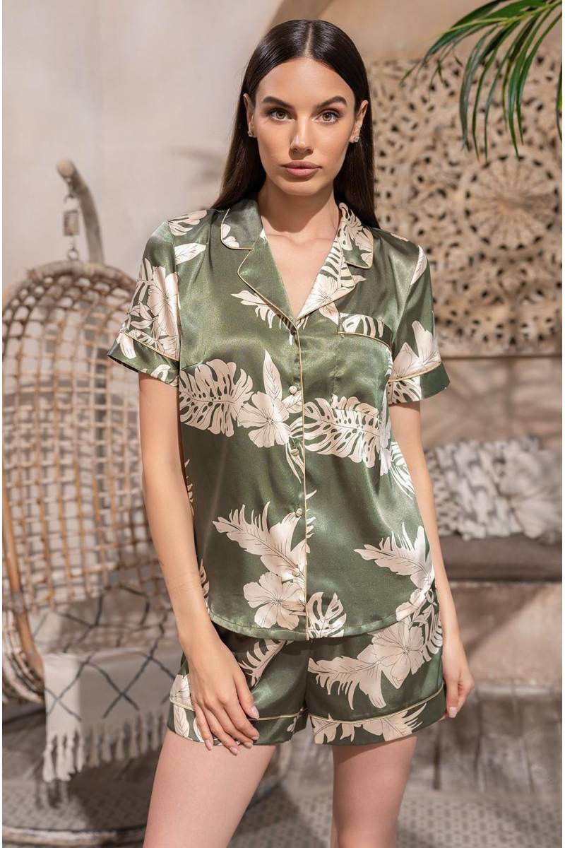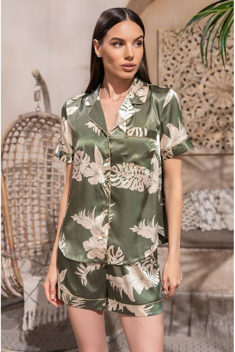 Женская пижама Mia-Amore Lorensa. Рубашка прямого кроя с застежкой на пуговицы. Коротткий втачной рукав. Полочка с нагрудным карманом. Низ сорочки с закругленными краями. Комфортные шорты с поясом на резинке. Боковые швы оформлены карманами. Комплект выполнен из шелкового смесового полотна с тропическим принтом. Отложной воротник и манжеты украшены тонким кантом в тон изделия. Состав 70% натуральный шёлк, 25% полиэстер, 5% эластан. Производитель Mia-Amore Италия