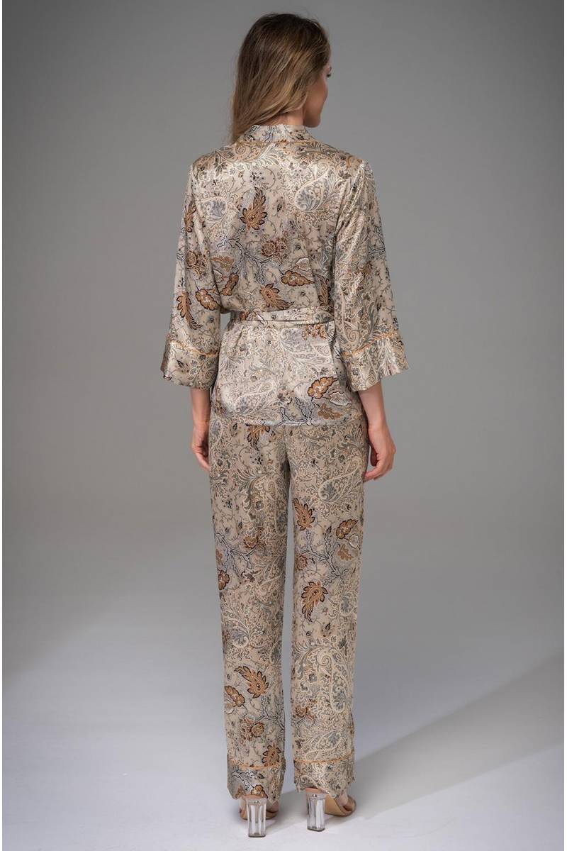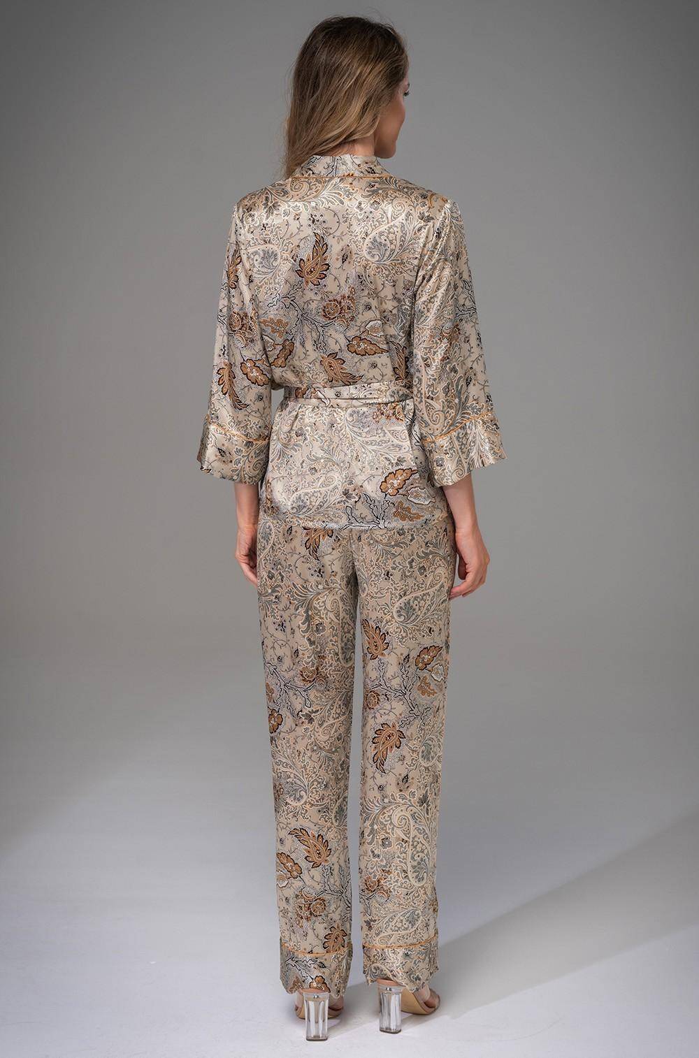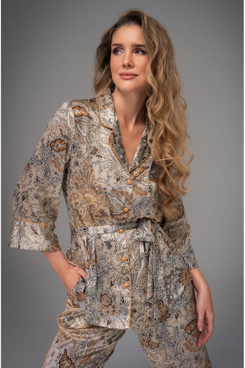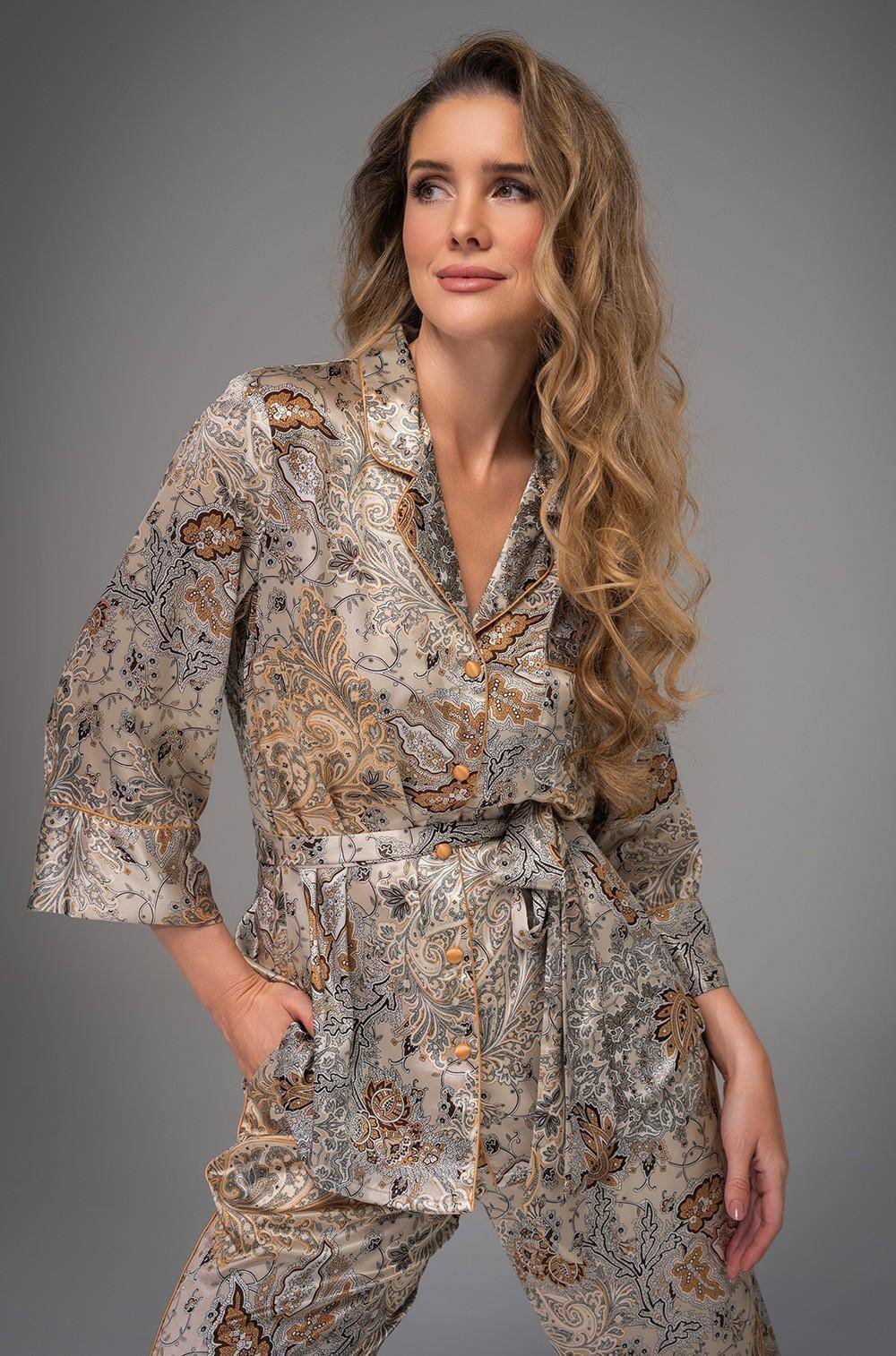 Женская пижама Mia-Amore коллекция livia двух предметов: Жакет с застежкой на пуговицы, пояс в комплекте. Втачной рукав 7/8 длины с широкими манжетами. Лацканы обработаны контрастным кантом в тон пуговиц. Классические прямые брюки с поясом на резинке, боковые швы оформлены карманами. Комплект выполнен из шелкового смесового полотна с восточным принтом пейсли. Состав 70% натуральный шёлк, 25% полиэстер, 5% эластан. Производитель Mia-Amore Италия.