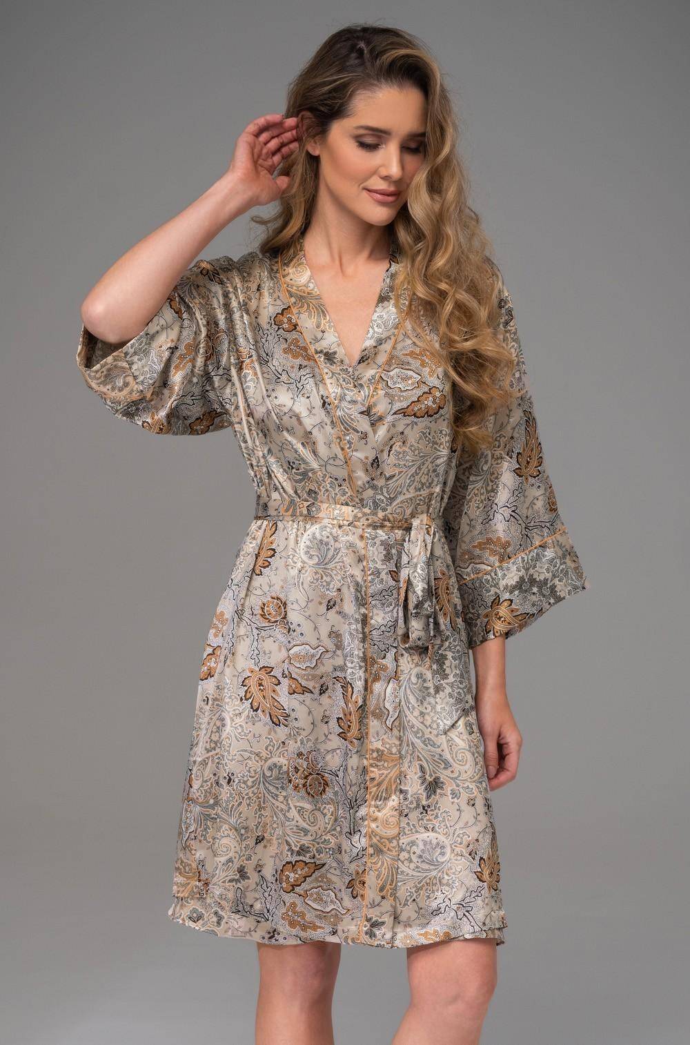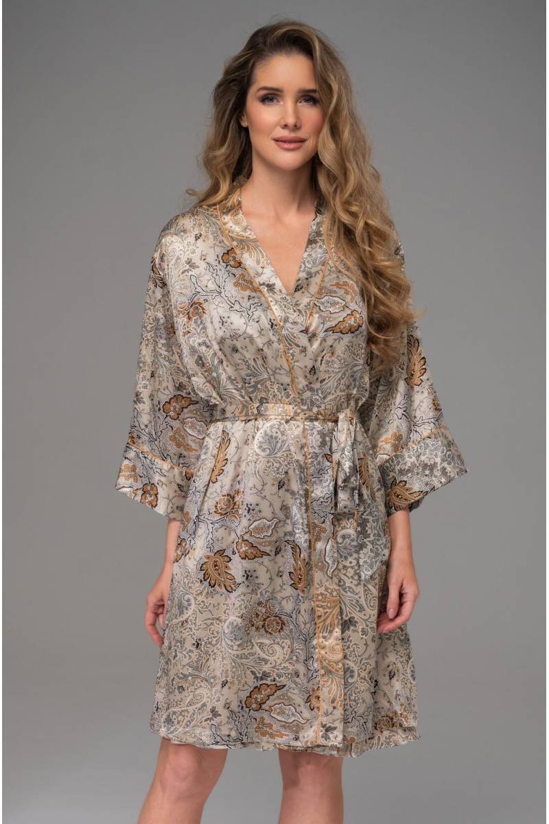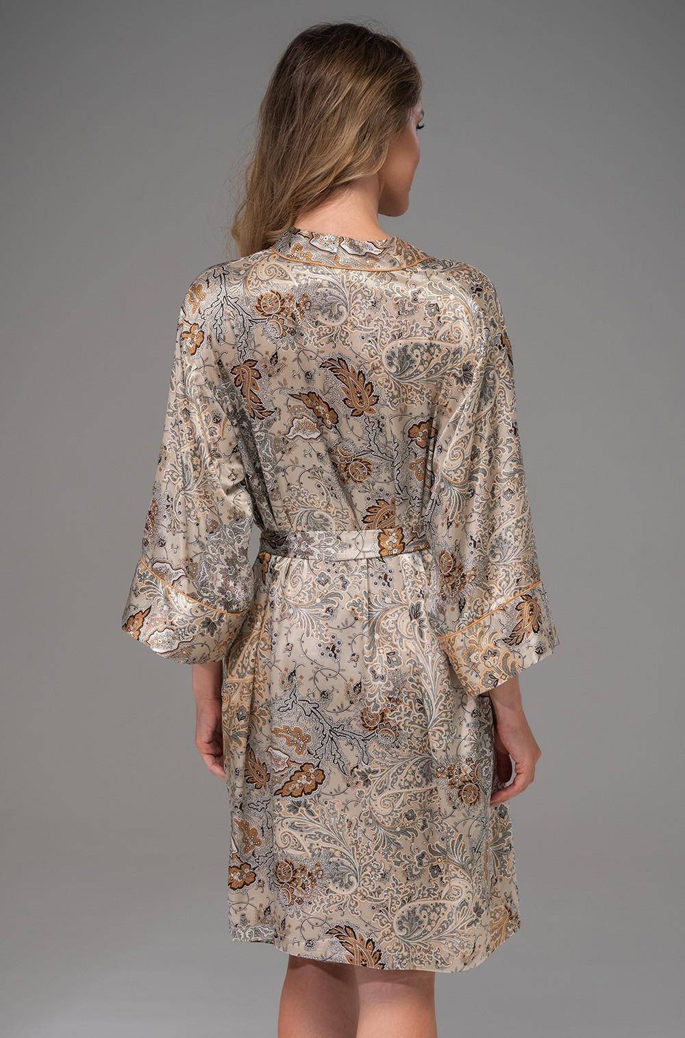 Женский короткий халат - Mia-Amore livia. Халат с запахо фиксируется поясом на талии. Широкий рукав 7/8 длины с манжетами. Боковые швы оформлены втачными карманами. Халат выполнен из шелкового смесового полотна с восточным принтом пейсли. Борта халата, манжеты на рукавах декорированы тонким контрастным кантом. Состав 70% натуральный шёлк, 25% полиэстер, 5% эластан. Производитель Mia-Amore Италия.