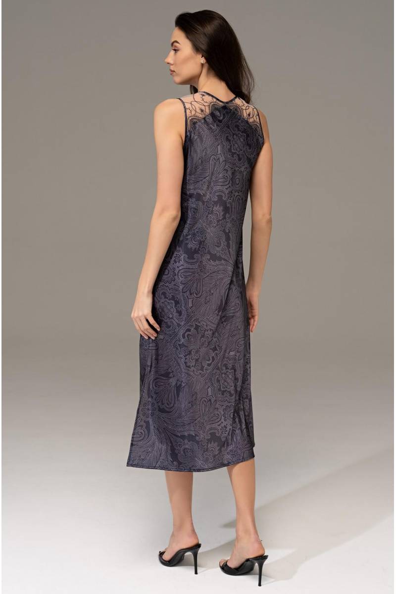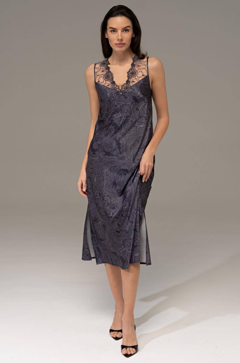 Ночная рубашка от итальянского бренда Mia-Amore - коллекция Aletta. Длина миди. Модель без рукавов с V-образным вырезом декольте. Верх полочки оформлен кружевной кокеткой, переходящей на спинку. Боковые нагрудные вытачки обеспечивают комфортное прилегание по груди. Декор - маленький атласный бантик с подвеской по центру декольте. Боковые швы с разрезами, которые создают дополнительный комфорт и обеспечивают свободу движения.Модель выполнена из натурального принтованного шелка. Состав 70% натуральный шелк, 25% полиэстер, 5% эластан. Бренд Mia-Amore Италия.