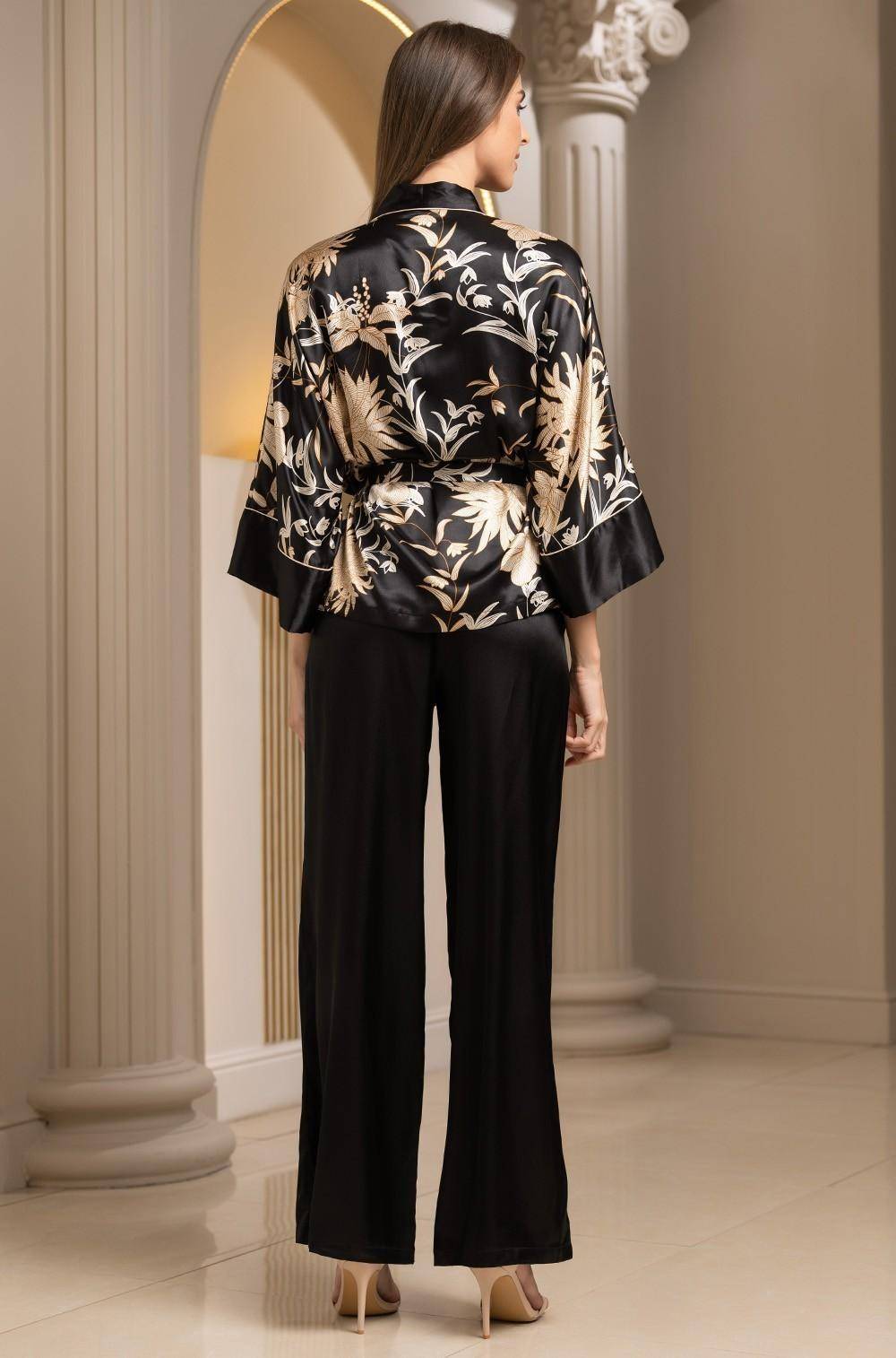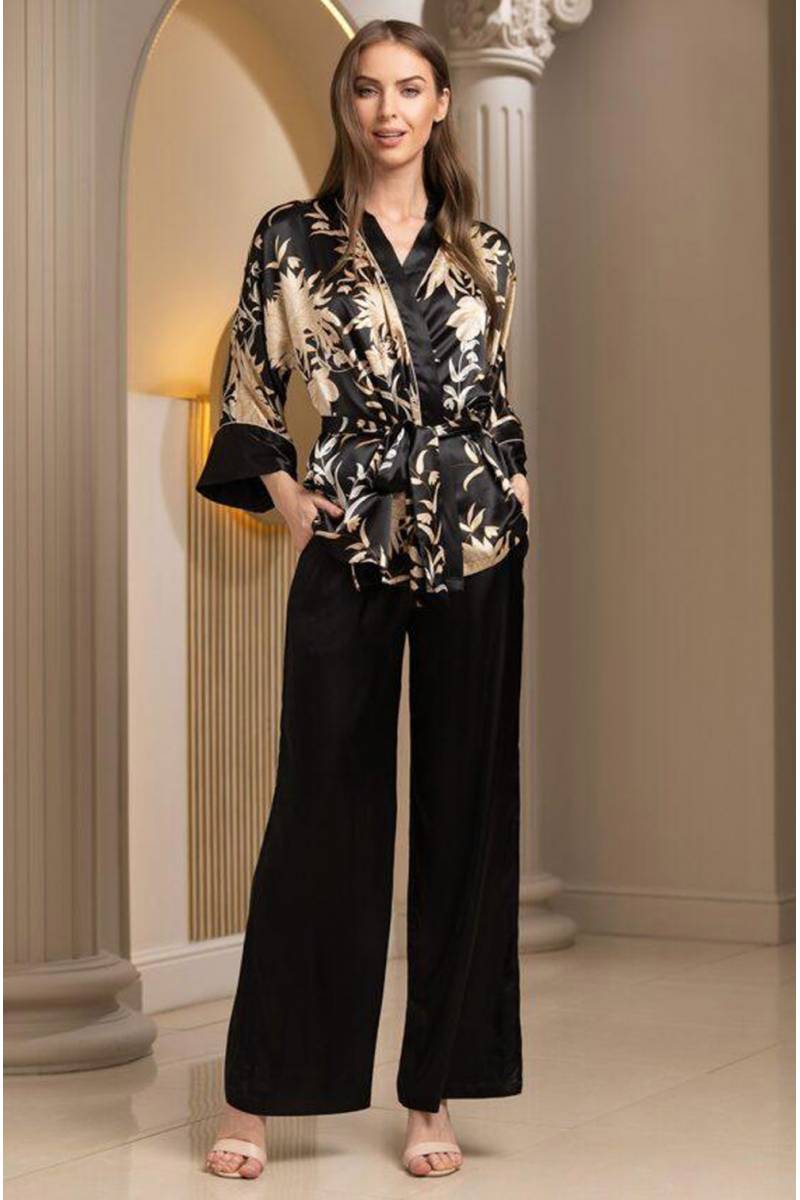 Женский домашний комплект Elmira от итальянского бренда Mia-Amore. Три предмета: Жакет на запах фиксируется поясом на талии. Рукава с широкими притачными манжетами. Топ на тонких регулируемых бретелях. Классические прямые брюки с поясом на резинке, боковые швы оформлены карманами. Жакет выполнен из шелкового смесового полотна с эффектным принтом. Топ и брюки - однотонный смесовый шелк. Состав 70% натуральный шёлк, 25% полиэстер, 5% эластан. Производитель Mia-Amore Италия.