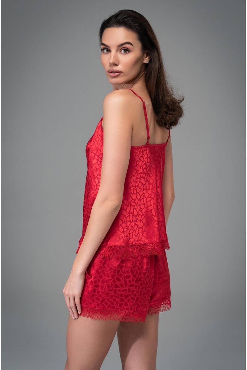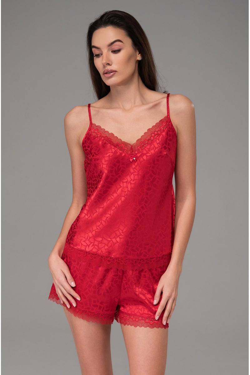 Коллекция Joanna от итальянского бренда бренда Mia-Amore. Пижамный комплект двойка: Топ прямого кроя на тонких регулируемых бретелях. Боковые нагрудные вытачки обеспечивают комфортное прилегание по груди, делая ее форму более выразительной. Шорты с эластичным поясом на резинке. Комплект выполнен из красного искусственного шелка на жаккардовой основе. Красный цвет символизирует страсть, энергию и сексуальность. Ажурное кружево, расположенное по верху/низу топа и низу шортиков, придает уникальной эффектности. Декор - атласный бантик с кристаллом Swarovski по центру выреза топа. Состав 100% полиэстер. Бренд Mia-Amore Италия.