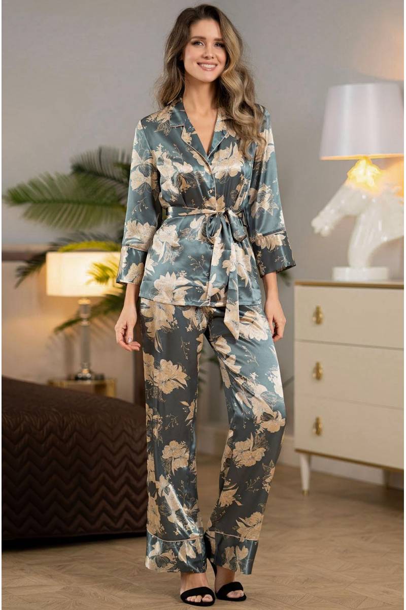Женский домашний комплект Ornelia 3836 от итальянского бренда Mia-Amore коллекции Ornelia. Элегантная женская пижама выполнена из смесового полотна на основе натурального шелка, дымчато-зеленого цвета с кремовым цветочным принтом: Жакет с рукавами 7/8 длины и отложным воротником, застежка на пуговицы, в комплекте пояс. Воротник, борта и рукава жакета оформлены тонким кантом кремового цвета. Прямые классические брюки с мягкой резинкой в поясе и удобными боковыми карманами, внизу широкие декоративные манжеты с тонким контрастным кантом. Стильный пижамный комплект может быть отличным подарком для любимой женщины. Состав: 70% натуральный шелк, 25% полиэстер, 5% эластан. Бренд Mia-Amore Италия.
