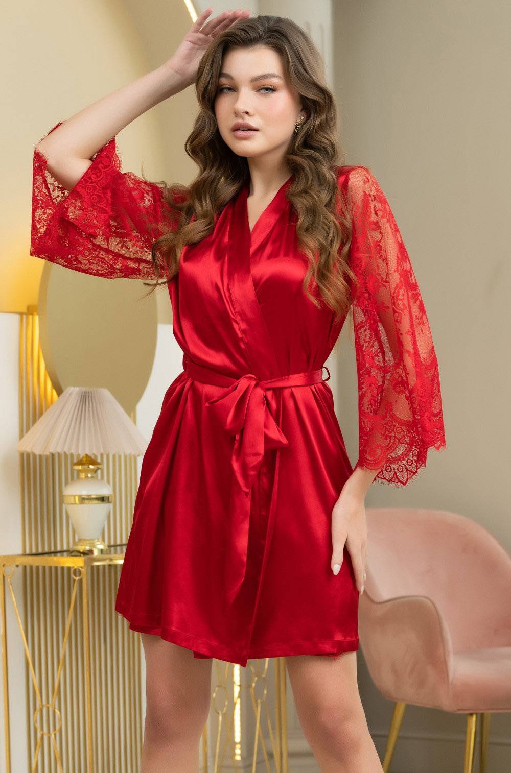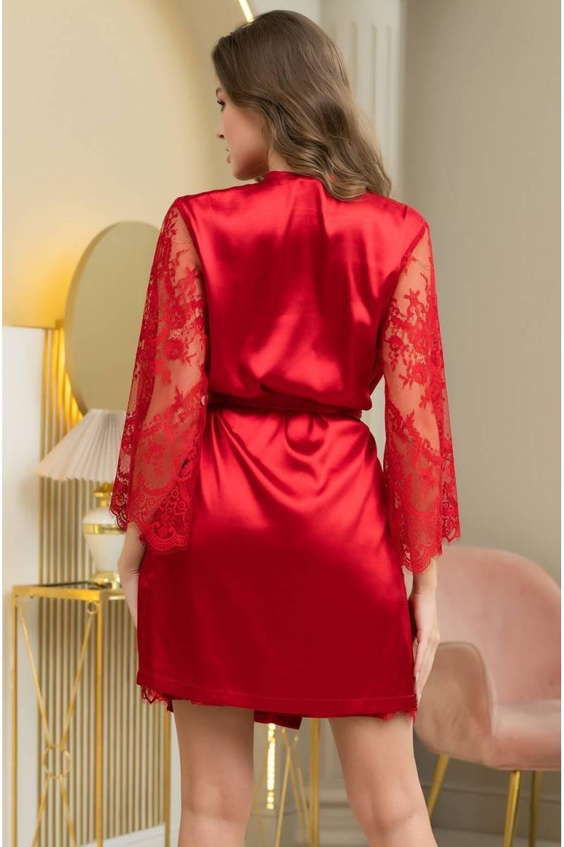 Женский короткий халат Mia-Amore Ester из атласного искусственного шелка в сексуальном красном цвете. Длинные полупрозрачные рукава из нежного кружева с фестончатыми краями. Боковые швы оформлены карманами. Халат на запах, фиксируется широким поясом на талии. Рошкошный халат можно дополнить сорочкой или комплектом из коллекции Ester. Состав 100% полиэстер. Бренд Mia-Amore Италия.