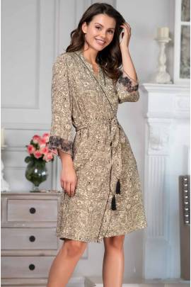 Короткий жіночий халат Mia-Amore на запах і поясом на талії з ефектними пензликами на кінцях. Втачной рукав 3/4 довжини оформлений тюлем з витонченою вишивкою. Халат виконаний з тканого віскозного полотна зі східним принтом "Пейслі" в благородних бежевих відтінках. Контрастний чорний кант підкреслює цілісність дизайну вироби. Склад: 100% віскоза. Бренд Mia-Mia-Amore Італія.
