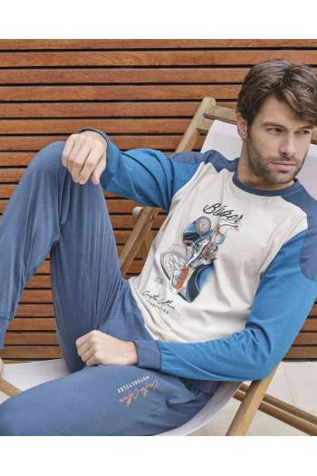 Чоловіча піжама від іспанського бренду Massana із двох предметів. Кофта з округлим вирізом горловини, який оброблений еластичним кантом у колір штанів. Довгі рукава. Прямі штани...