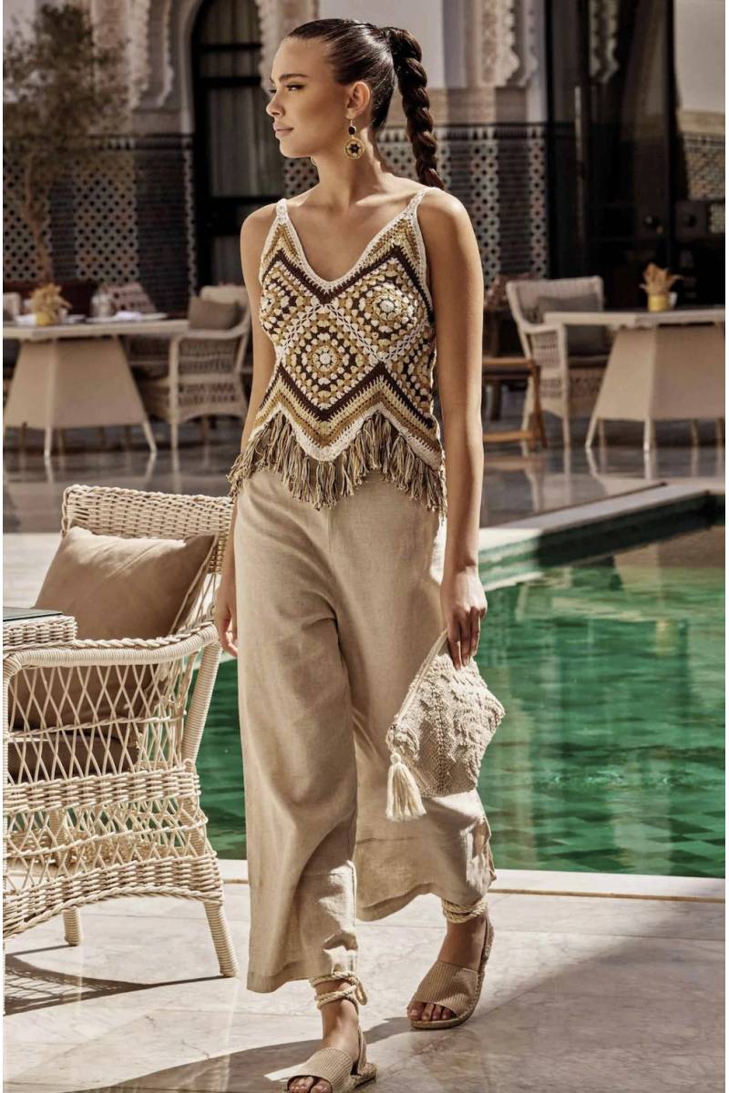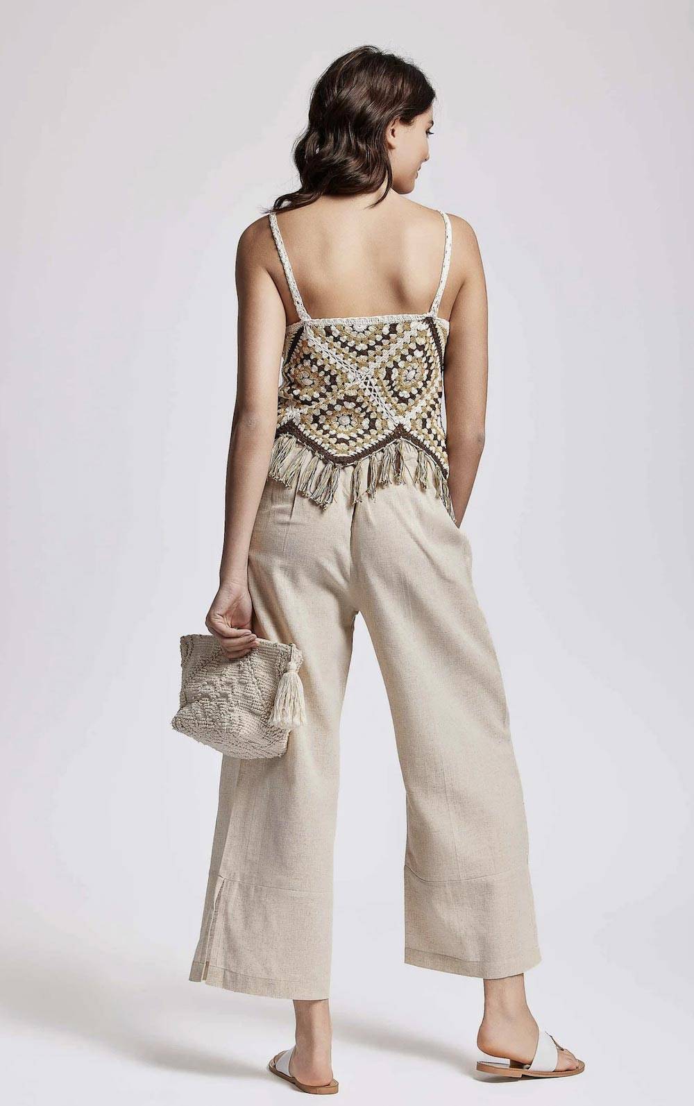 Стильний літній комплект італійського бренду Iconique: Майка на тонких бретелях, низ оформлений бахрамою. Виконана ручною в'язкою гачком із бавовняних різнокольорових ниток. Комфортні штани вільного крою з віскози. Склад: ТОП: Бавовна 100%, ШЛЮНИ: віскоза 60%, льон 40%. Модні двійки для літнього відпочинку. Бренд Iconique Італія.