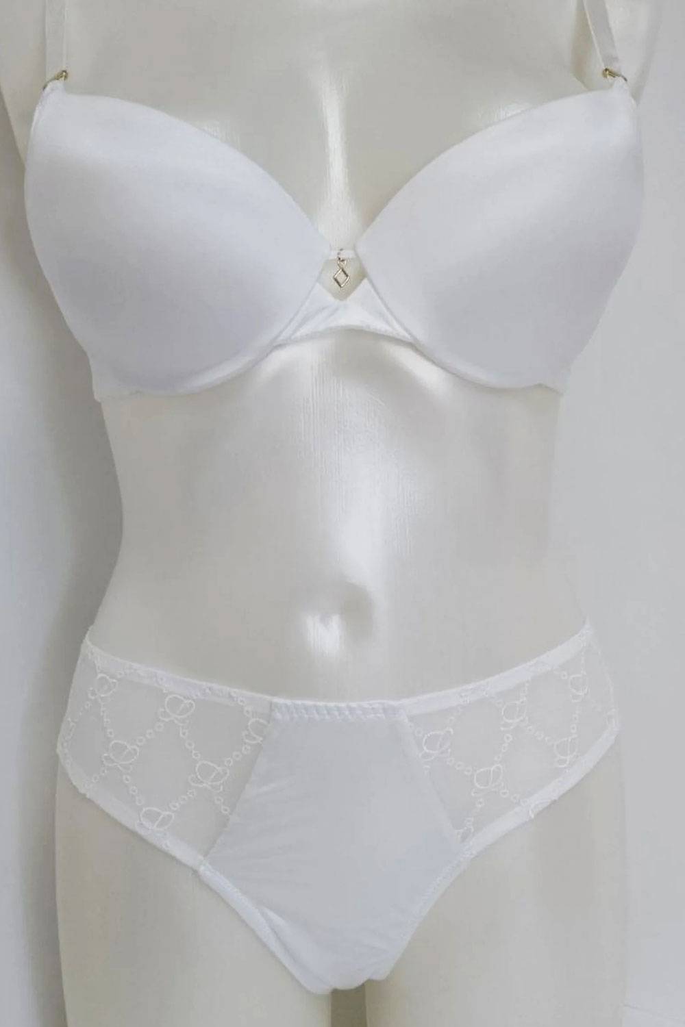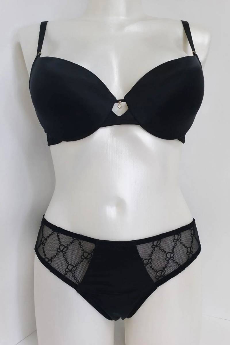 Нова модна колекція MY LOOK від Leilieve демонструє поєднання комфорту та елегантності. Бюстгальтер на кісточках із вбудованим невеликим пуш ап. Регульовані незнімні бретелі. Спинка із застібкою на два гачки та чотири позиції об'єму. Бюстгальтер піднімає груди і створює спокусливу улоговинку, формуючи округлу форму грудей. Трусики бразіліана не виділяються під одягом завдяки сучасній обробці зрізів. Комплект виконаний з ніжної еластичної мікрофібри в комбінації із напівпрозорим тюлем із вишивкою. Склад 67% поліестер та 33% еластан. Бренд Leilieve Італія.