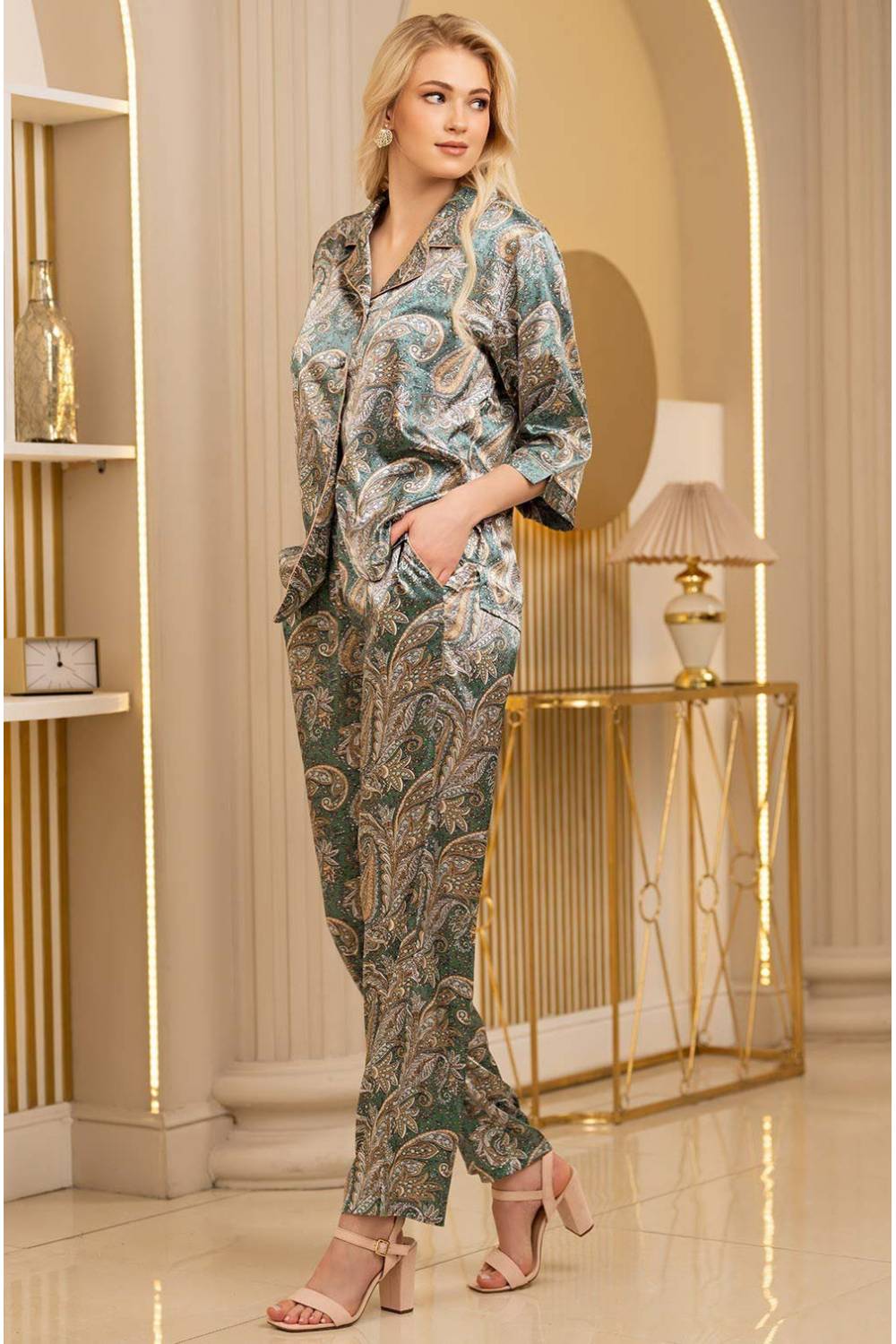 Жіночий комплект з шовку: блуза з застібкою на гудзики з рукавом довжиною 3/4 і довгі класичні брюки з бічними карманаіт і розрізами по низу штанин. Комплект виконаний з смесового полотна з елегантним східним принтом "Пейслі". Приголомшливе поєднання колірних відтінків тканини підкреслені округлими формами і квітковими мотивами малюнка. Склад 70% натуральний шовк, 25% поліестер, 5% еластан. Виробник Mia-Mia Італія.