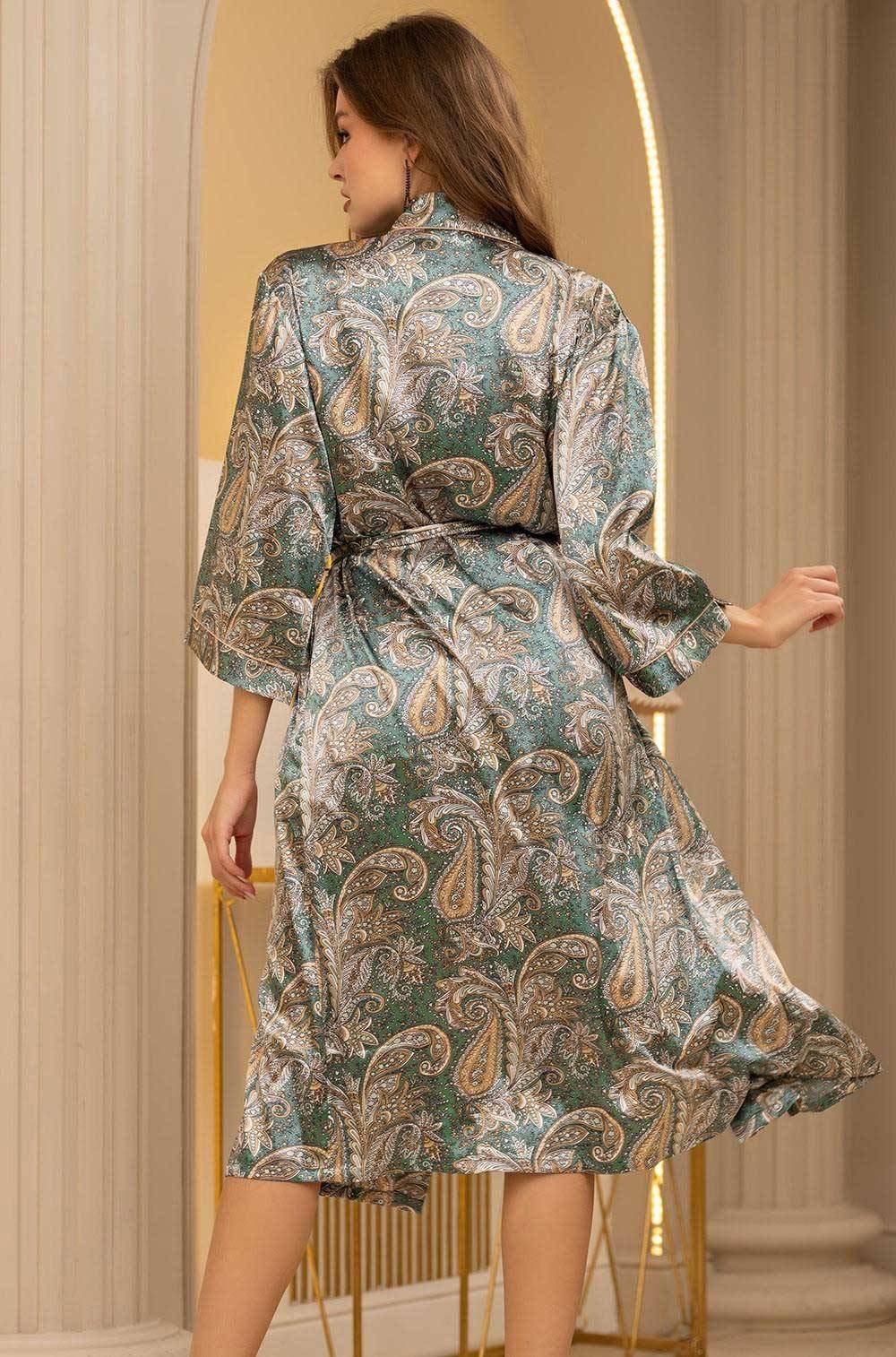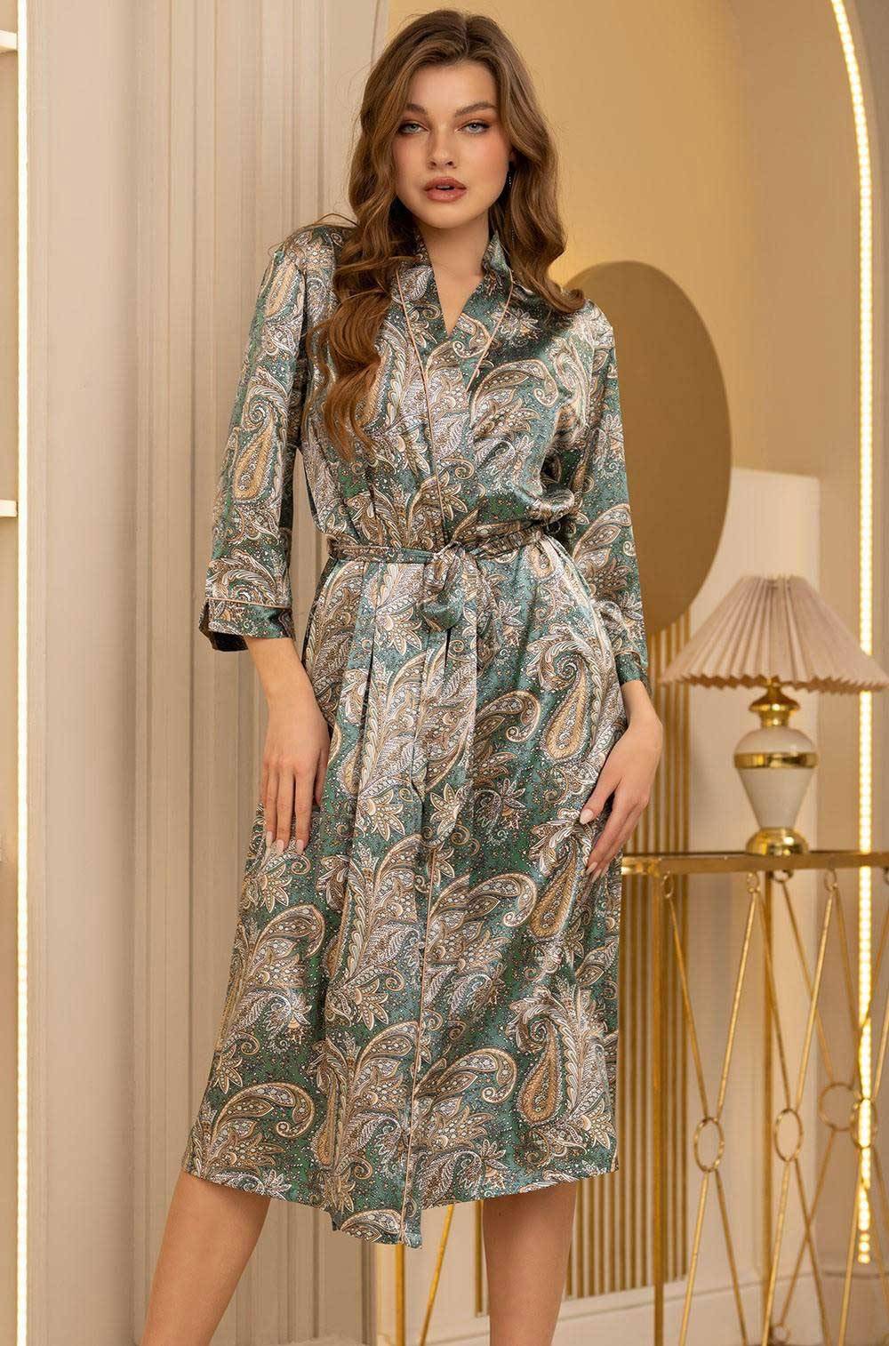 Довгий жіночий халат на запах з поясом, бокові кишені, довгий рукав. Халат з смесового полотна з чудовим принтом "Пейслі". Борти вироби і низ рукава декоровані контрастним кантом. Склад 70% натуральний шовк, 25% поліестер, 5% еластан. Виробник Mia-Mia Італія.