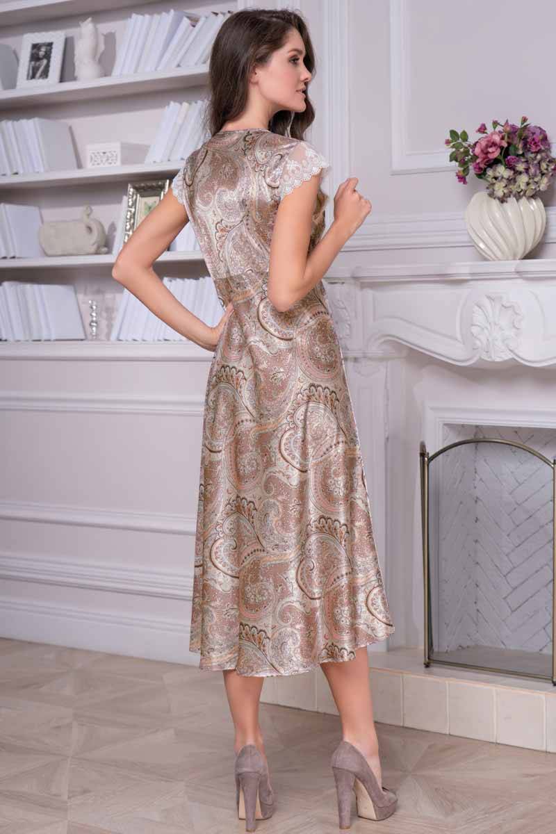 Елегантна довга сорочка прилеглого силуету. Короткий втачной рукав з мережива. Сорочка з подрезом під грудьми і глибоким V-подібним вирізом декольте, оформленим витонченим мереживом. Сорочка виконана з смесового шовку в пастельних тонах з східним принтом "Пейслі". Склад: 70% натуральний шовк, 25% поліестер, 5% еластан. Виробник Mia-Amore Італія.