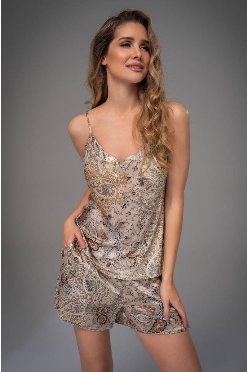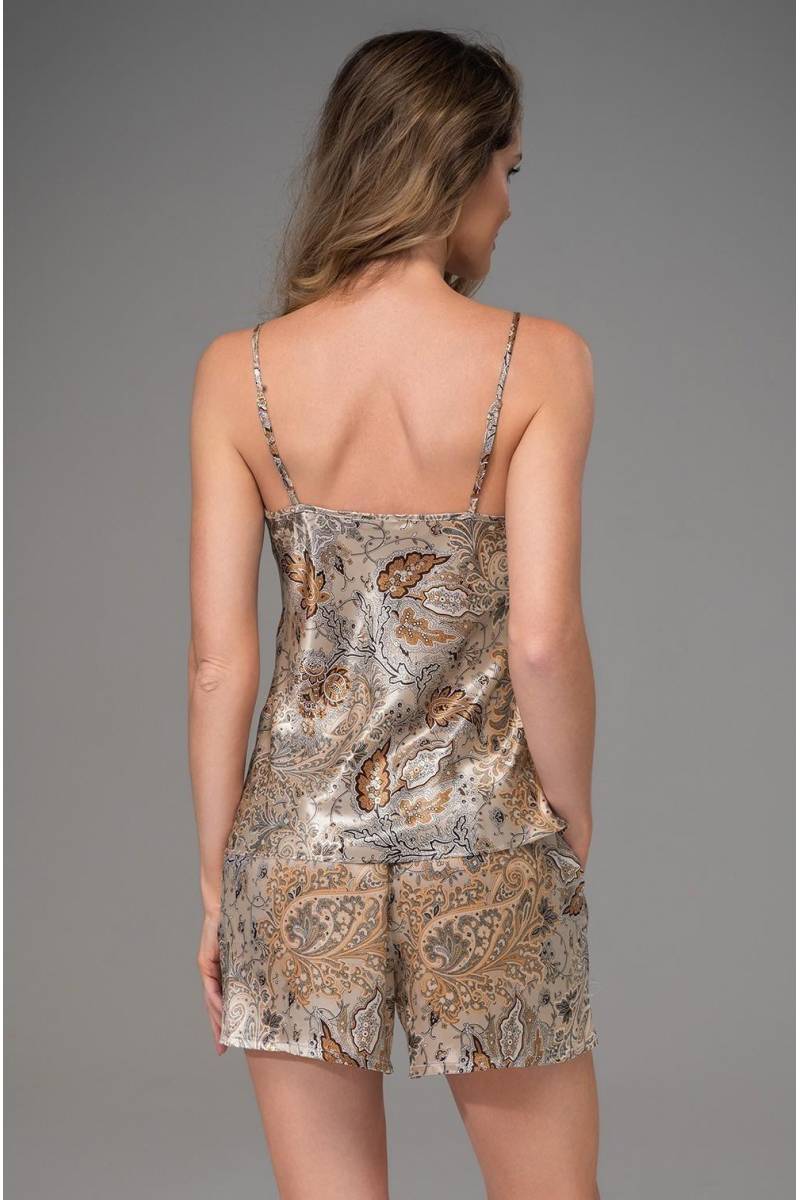 Жіноча піжама Mia-Amore колекція livia двох предметів: Топ на тонких бретелях з V-подібним вирізом. Шорти на еластичному поясі із бічними кишенями. Комплект виконаний із сумішевого шовку з ефектним східним принтом пейслі. Лінія декольте оформлена тонким контрастним кантом. Склад 70% натуральний шовк, 25% поліестер, 5% еластан. Бренд Mia-Amore Італія.