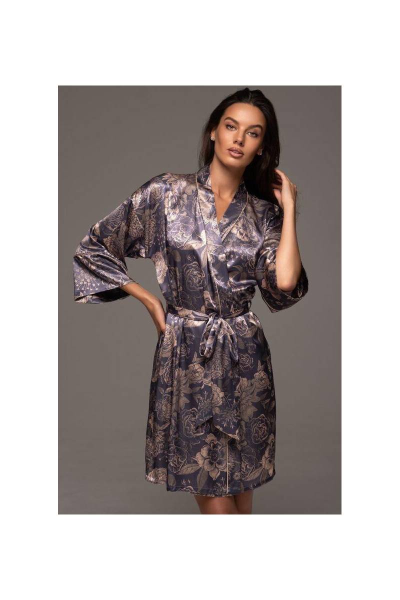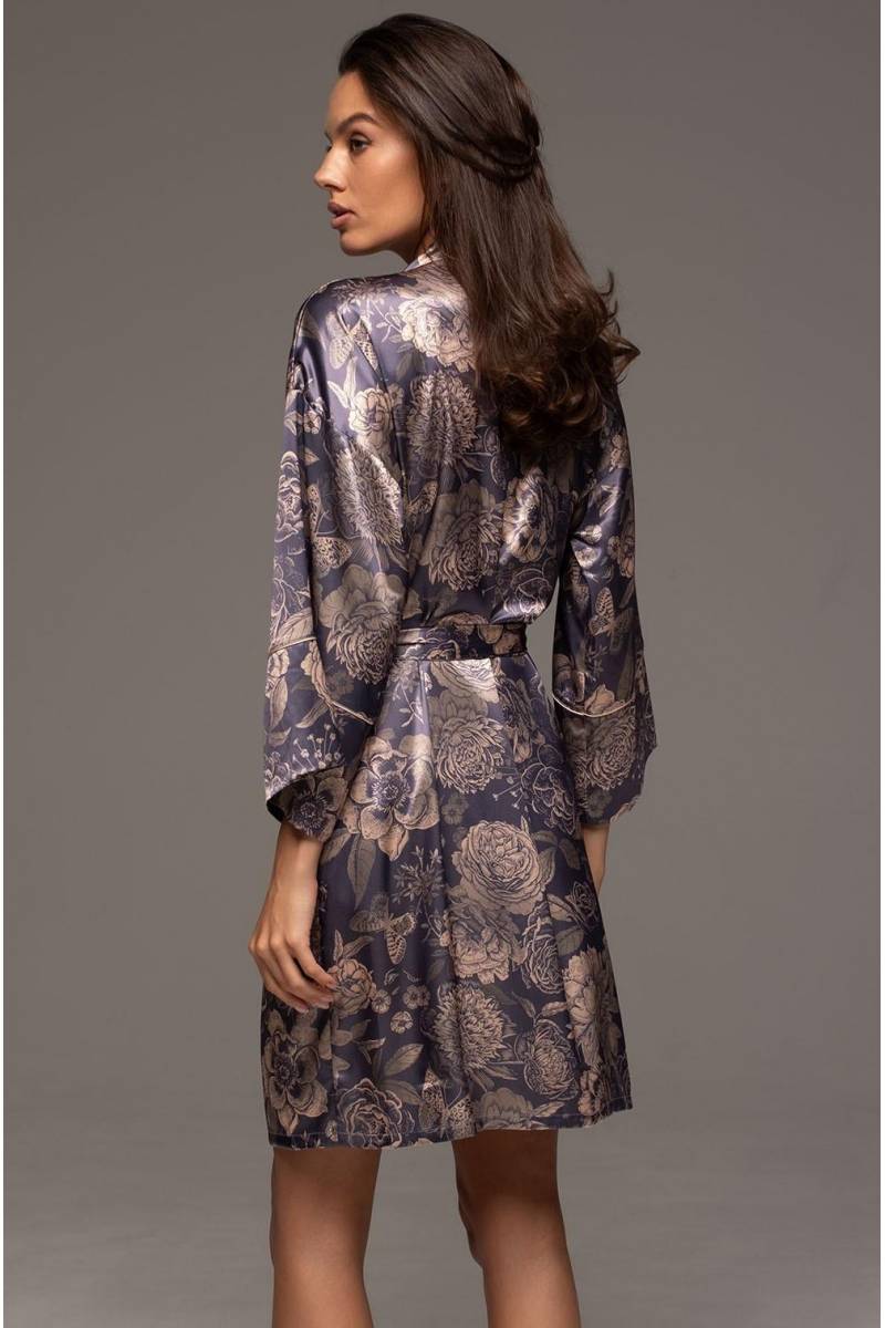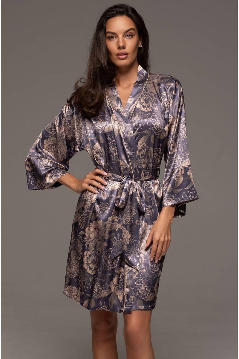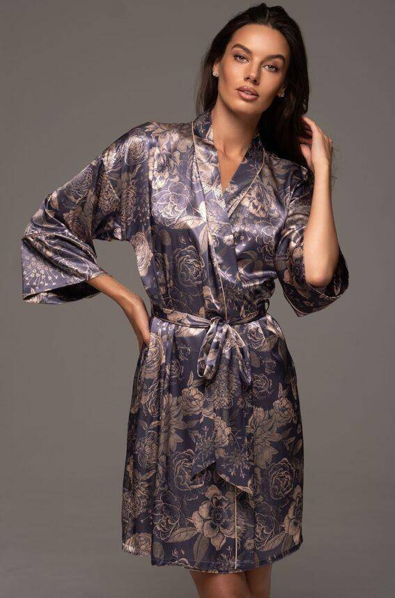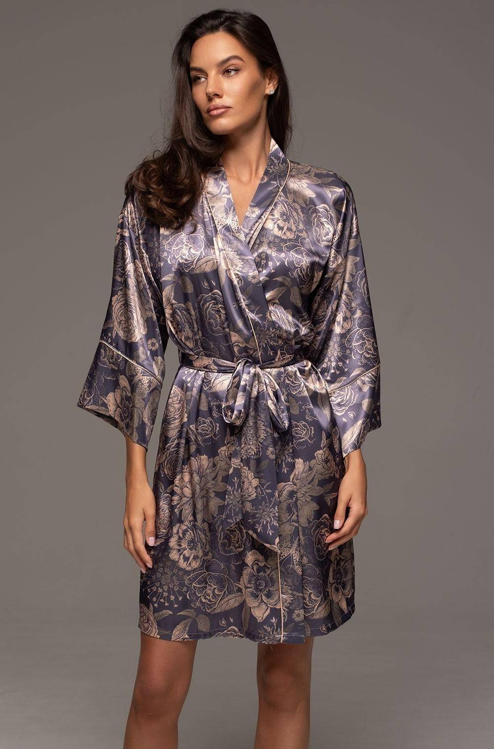 Короткий халат-кімоно від італійського бренду Mia-Amore – колекція Giaconda. Халат прямого силуету із запахом фіксується поясом на талії. Рукави 3/4 з широкими манжетами. Декор - вузький однотонний кант по лінії бортів та манжет. Бічні шви оформлені кишенями. Халат виконаний із сумішевого шовкового полотна із ефектним 3D принтом. Склад: 70% натуральний шовк, 25% поліестер, 5% еластан. Виробник Mia-Amore Італія.