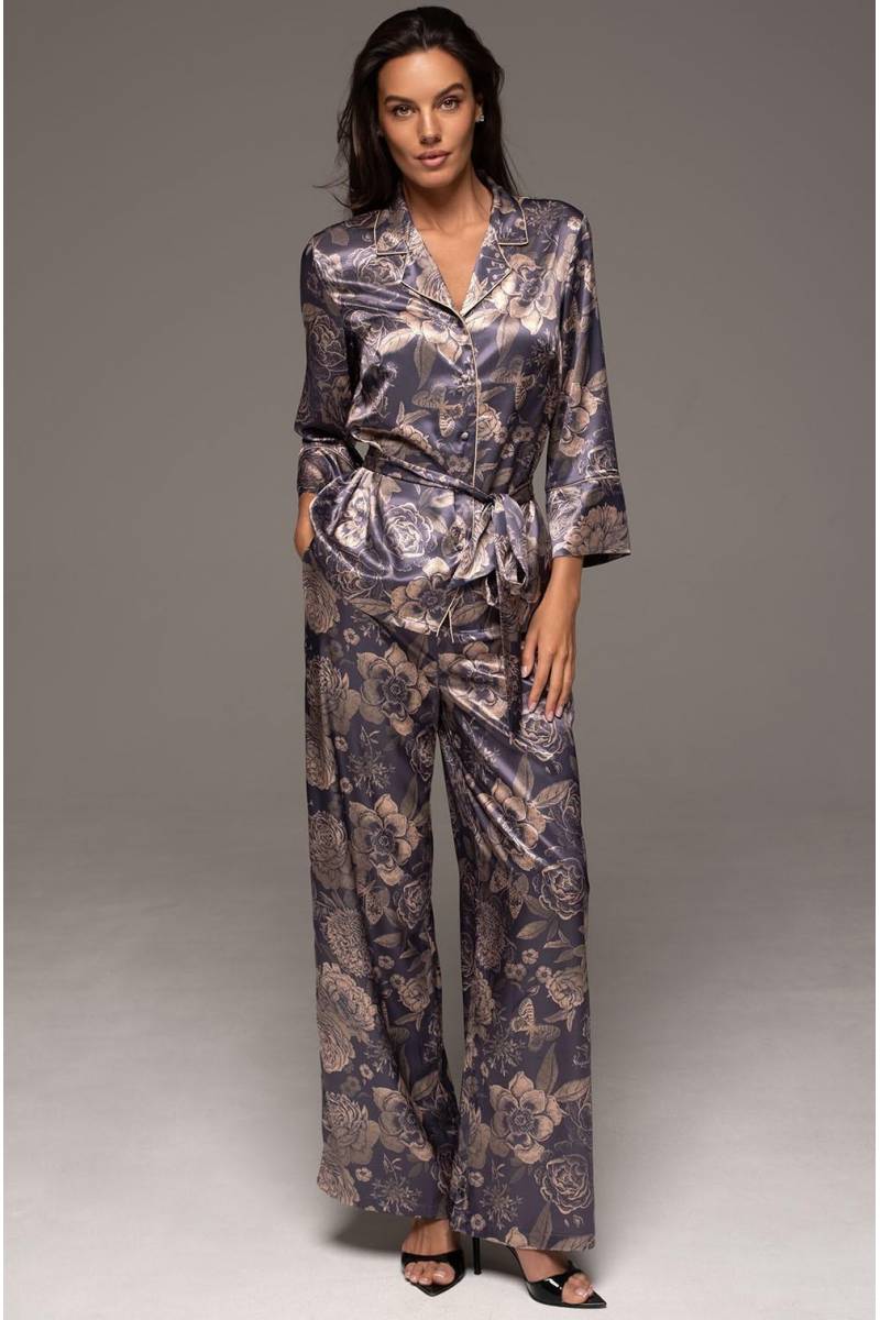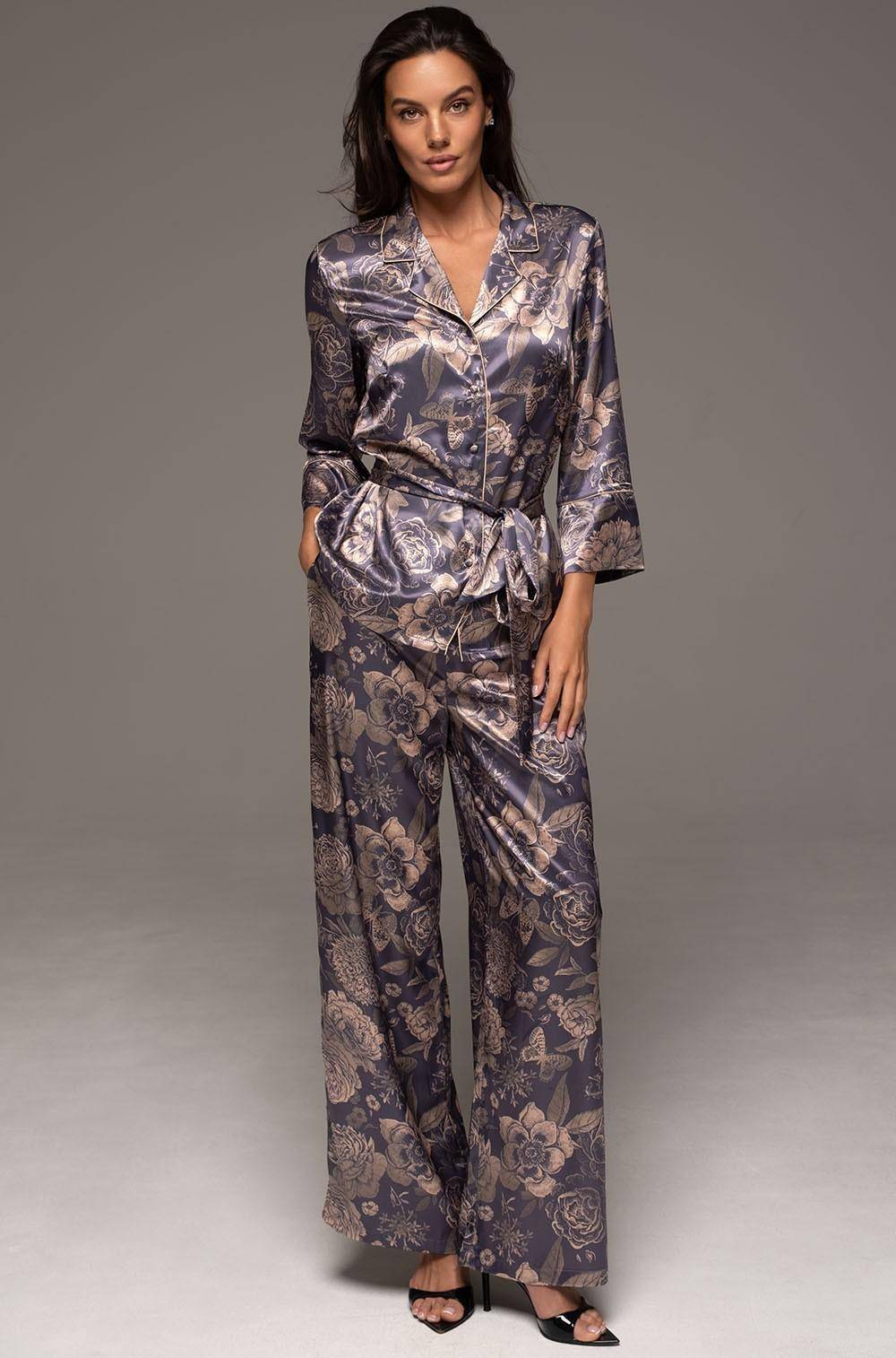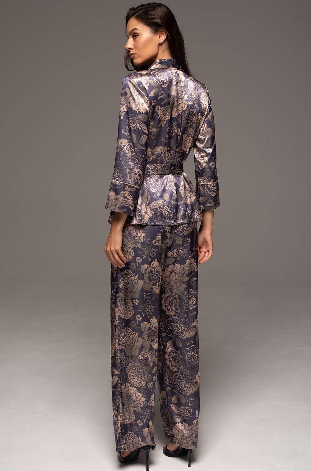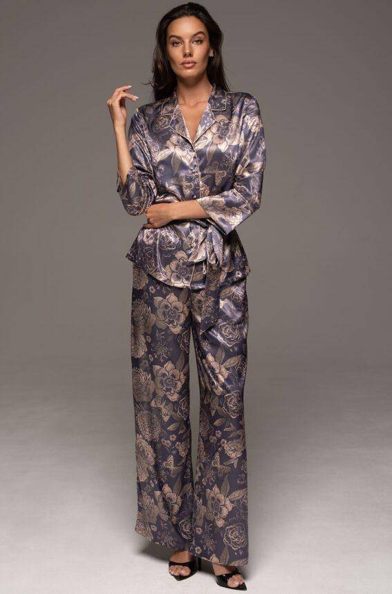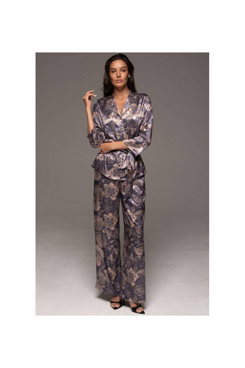 Жіночий домашній комплект Giaconda від італійського бренду Mia-Amore із двох предметів. Жакет фіксується застібкою на гудзики, пояс у комплекті. Відкладний комір з лацканами. Рукави 7/8 довжини з широкими манжетами. Класичні прямі штани з поясом на гумці, бічні шви оформлені кишенями. Комплект виконаний із шовкового сумішевого полотна з ефектним 3-Д принтом. Декор – тонкий однотонний кант. Склад 70% натуральний шовк, 25% поліестер, 5% еластан. Виробник Mia-Amore Італія.
