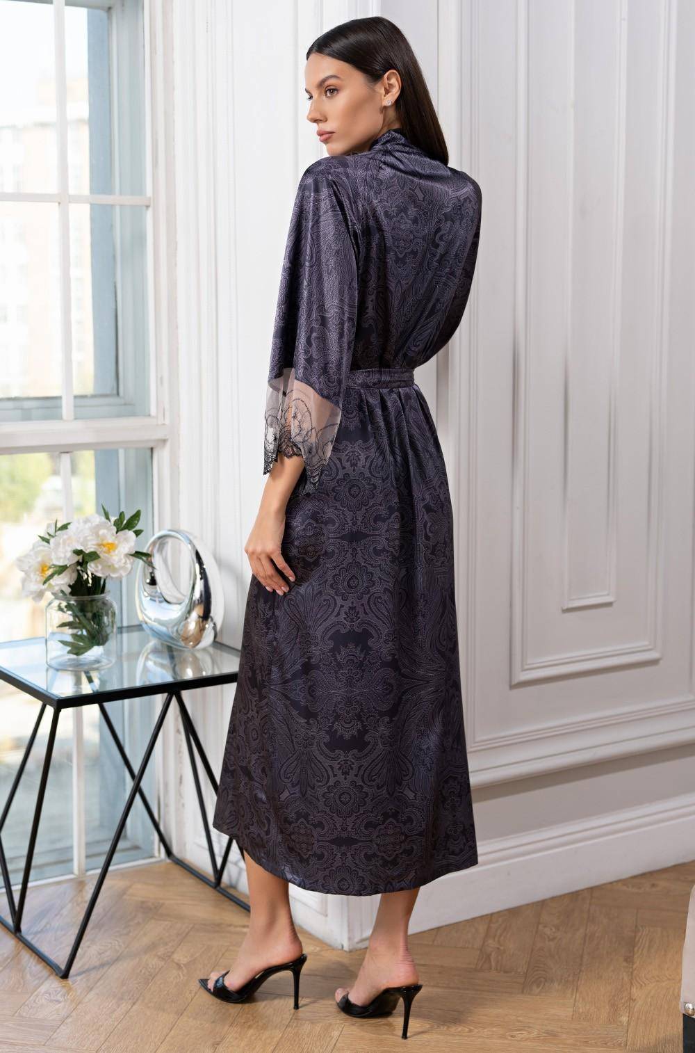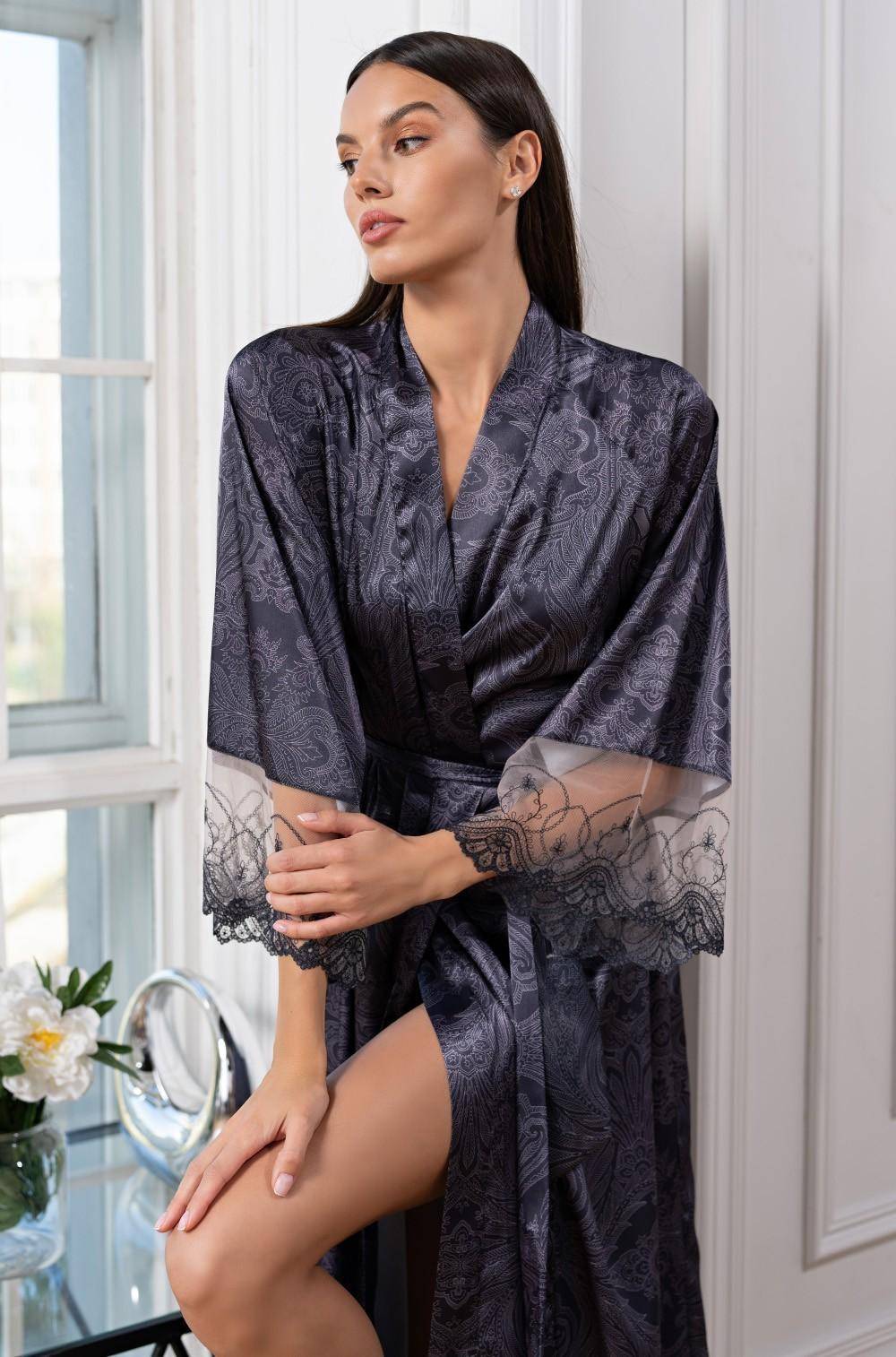 Жіночий халат Mia-Amore Aletta 4449 прямого силуету на запах. Довжина міді. У комплекті йде пояс із фіксацією на талії. Втачні рукави довжиною 7/8 внизу оформлені широким ажурним мереживом. Для зручності халат забезпечений бічними кишенями. Комфортна модель не сковує рухів, має гідний презентабельний вигляд, чудово підійде на подарунок. Склад 70% натуральний шовк, 25% поліестер, 5% еластан. Виробник Mia-Amore Італія.