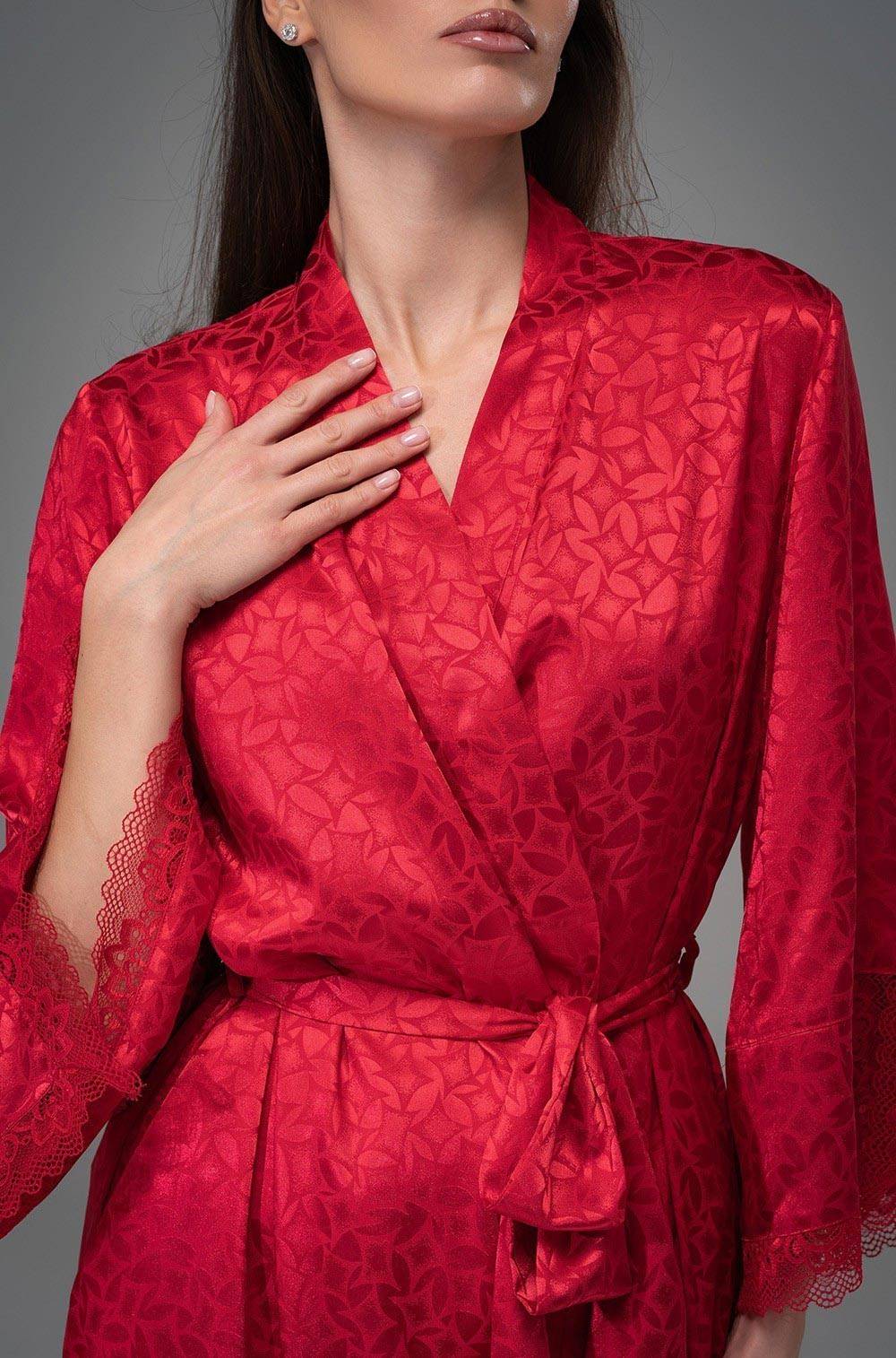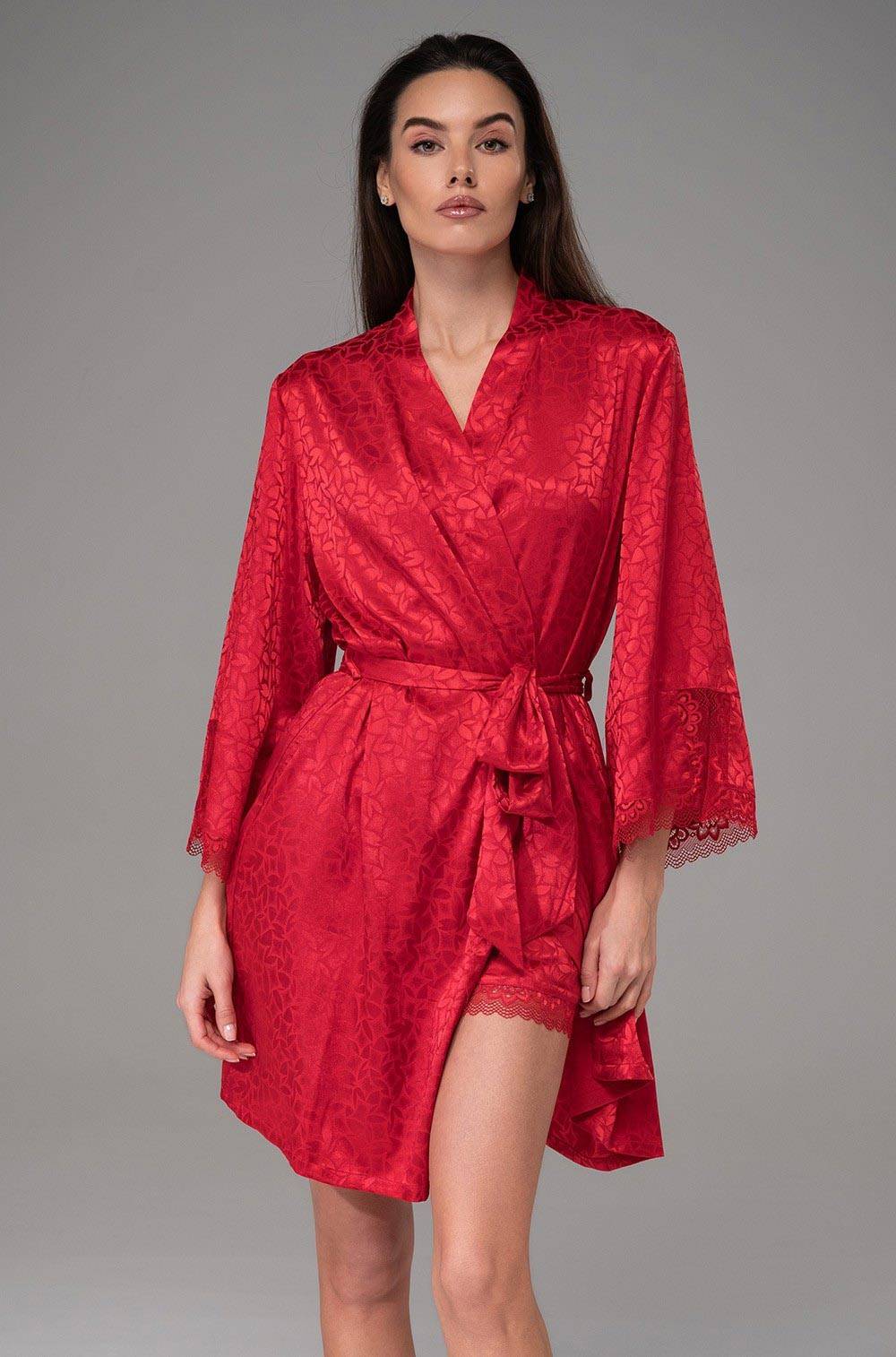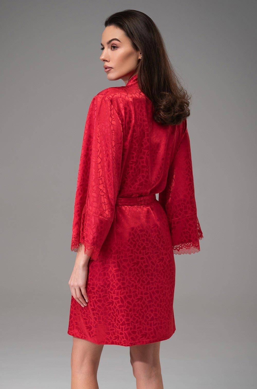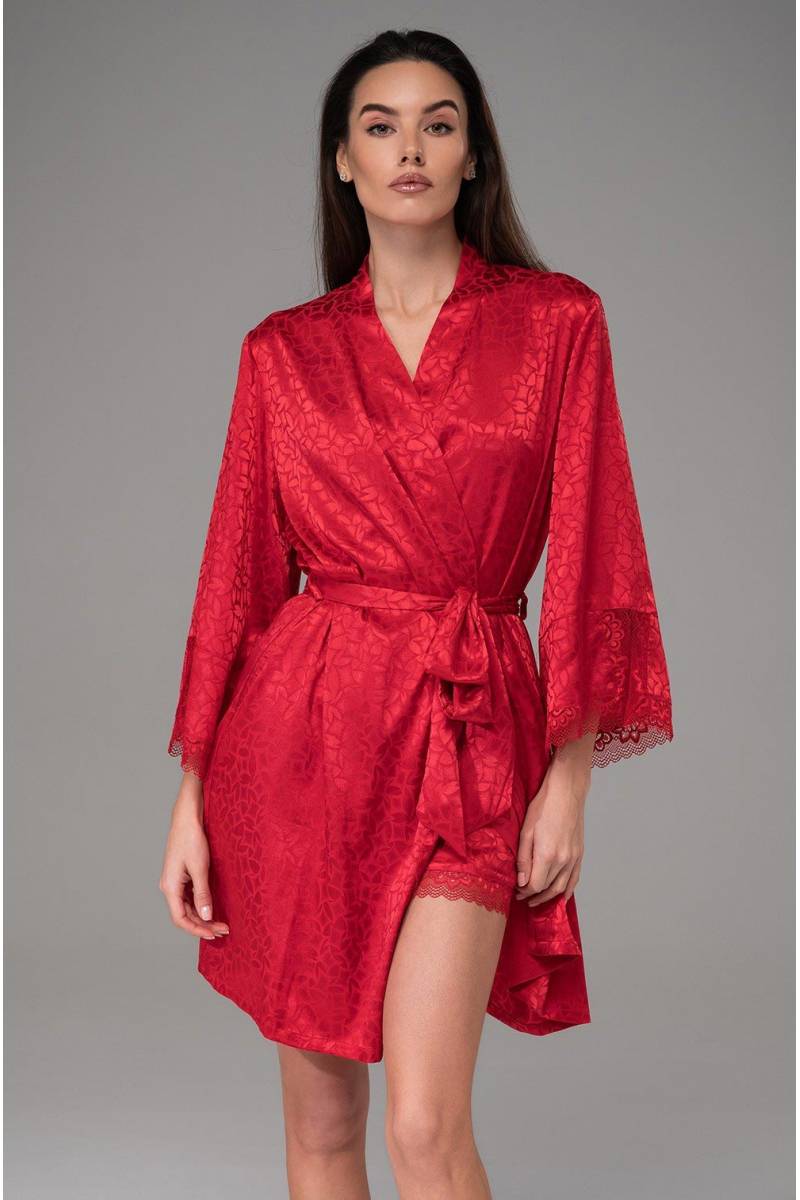 Колекція Joanna ТМ Mia-Amore. Короткий жіночий халат із запахом фіксується поясом на талії. Широкі втачні рукави довжиною 3/4 по низу оформлені розрізами та витонченим мереживом. З боків халата розташовані кишені. Халат виконаний з червоного штучного шовку на жакардовій основі. Червоний колір символізує пристрасть, енергію та сексуальність. Ажурне мереживо надає образу жіночності, вишуканості та романтичності. Склад 100% поліестер. Бренд Mia-Amore Італія.