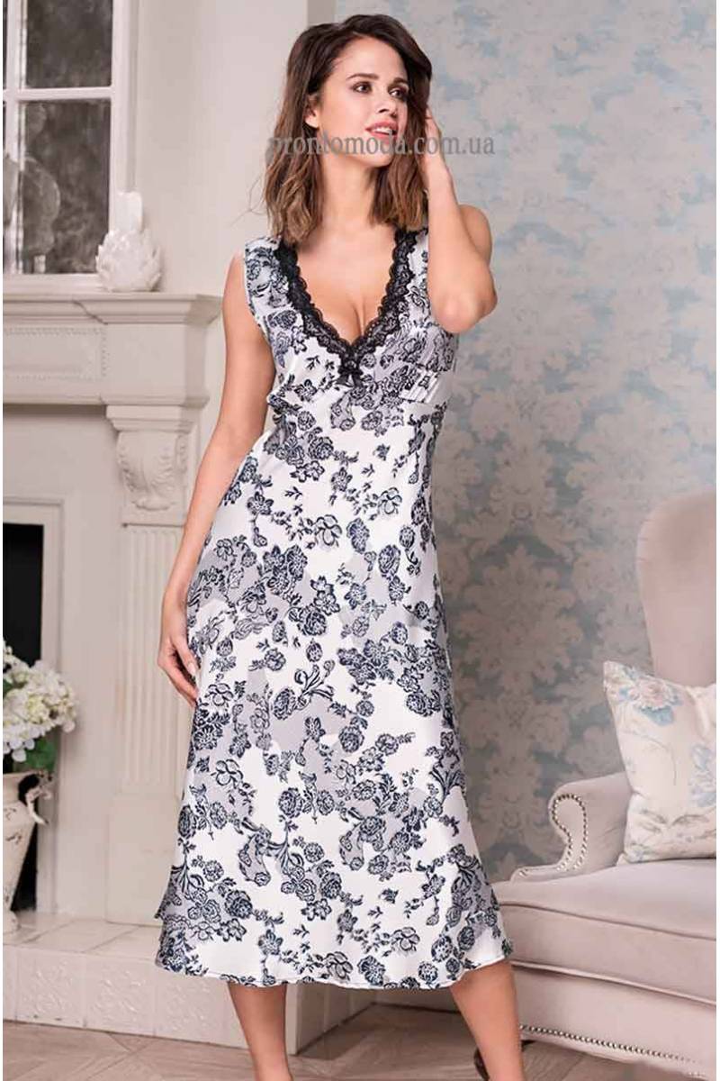 Довга нічна сорочка полупрілегающего силуету з відрізним ліфом і глибоким V-подібним вирізом декольте. Модель виконана з ніжного штучного шовку з квітковим принтом в біло-чорній кольоровій гамі і оформлена чорним мереживом. Склад 100% поліестер. Виробник Mia-Mella Італія.